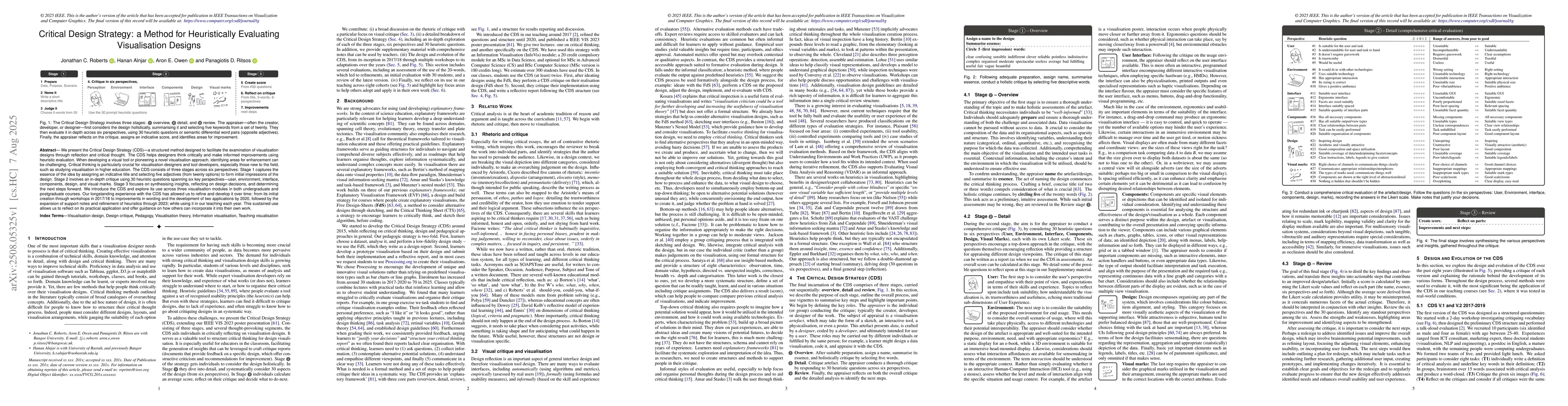 We present the Critical Design Strategy (CDS) - a structured method designed to facilitate the examination of visualisation designs through reflection and critical thought. The CDS helps designers think critically and make informed improvements using heuristic evaluation. When developing a visual tool or pioneering a novel visualisation approach, identifying areas for enhancement can be challenging. Critical thinking is particularly crucial for visualisation designers and tool developers, especially those new to the field, such as studying visualisation in higher education. The CDS consists of three stages across six perspectives: Stage 1 captures the essence of the idea by assigning an indicative title and selecting five adjectives (from twenty options) to form initial impressions of the design. Stage 2 involves an in-depth critique using 30 heuristic questions spanning six key perspectives - user, environment, interface, components, design, and visual marks. Stage 3 focuses on synthesising insights, reflecting on design decisions, and determining the next steps forward. We introduce the CDS and explore its use across three visualisation modules in both undergraduate and postgraduate courses. Our longstanding experience with the CDS has allowed us to refine and develop it over time: from its initial creation through workshops in 2017/18 to improvements in wording and the development of two applications by 2020, followed by the expansion of support notes and refinement of heuristics through 2023; while using it in our teaching each year. This sustained use allows us to reflect on its practical application and offer guidance on how others can incorporate it into their own work.