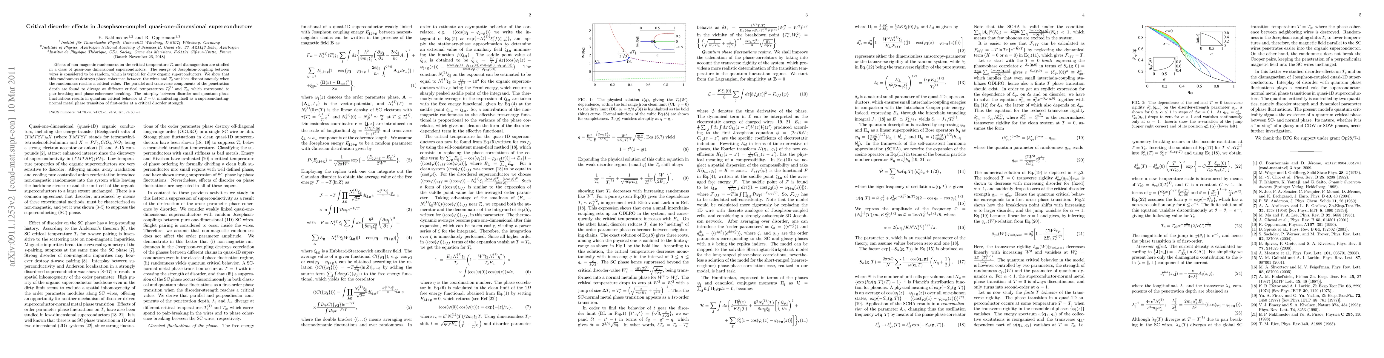 Effects of non-magnetic randomness on the critical temperature T_c and diamagnetism are studied in a class of quasi-one dimensional superconductors. The energy of Josephson-coupling between wires is considered to be random, which is typical for dirty organic superconductors. We show that this randomness destroys phase coherence between the wires and T_c vanishes discontinuously when the randomness reaches a critical value. The parallel and transverse components of the penetration depth are found to diverge at different critical temperatures T_c^{(1)} and T_c, which correspond to pair-breaking and phase-coherence breaking. The interplay between disorder and quantum phase fluctuations results in quantum critical behavior at T=0, manifesting itself as a superconducting-normal metal phase transition of first-order at a critical disorder strength.