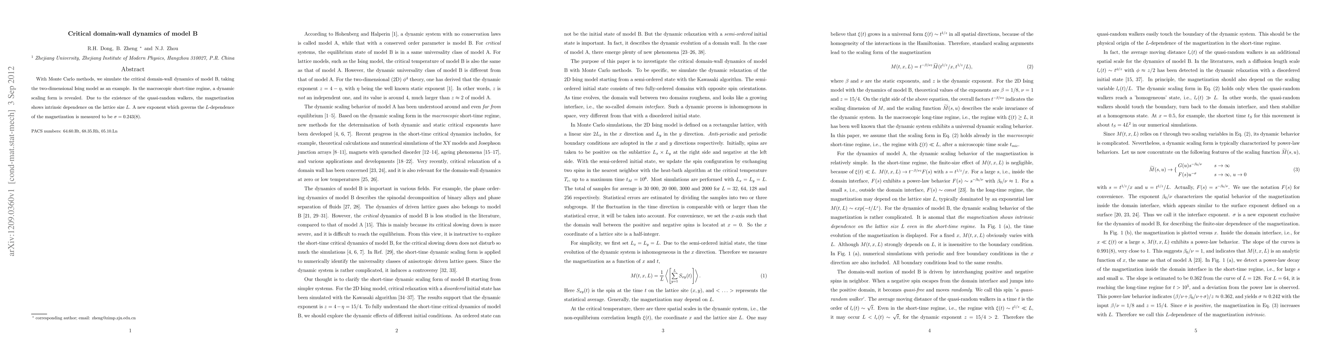This paper uses Monte Carlo simulations to study the critical domain-wall dynamics in model B, exemplified by the two-dimensional Ising model. The study reveals a dynamic scaling form in the macroscopic short-time regime, with a new exponent $\sigma=0.243(8)$ governing the lattice size $L$-dependence of magnetization due to quasi-random walkers.