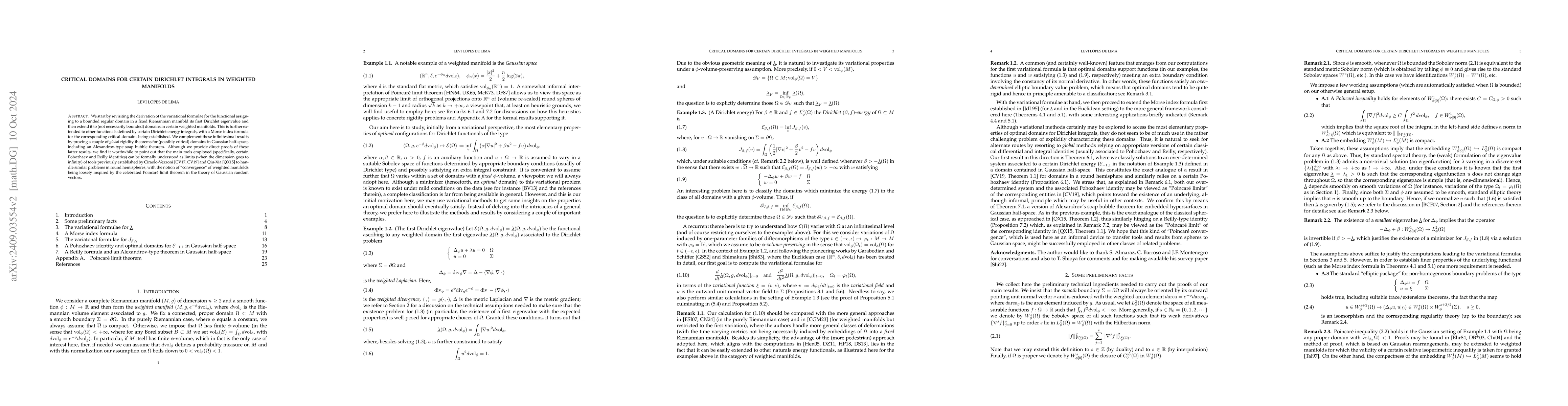 We start by revisiting the derivation of the variational formulae for the functional assigning to a bounded regular domain in a Riemannian manifold its first Dirichlet eigenvalue and extend it to (not necessarily bounded) domains in certain weighted manifolds. This is further extended to other functionals defined by certain Dirichlet energy integrals, with a Morse index formula for the corresponding critical domains being established. We complement these infinitesimal results by proving a couple of global rigidity theorems for (possibly critical) domains in Gaussian half-space, including an Alexandrov-type soap bubble theorem. Although we provide direct proofs of these latter results, we find it worthwhile to point out that the main tools employed (specifically, certain Pohozhaev and Reilly identities) can be formally understood as limits (when the dimension goes to infinity) of tools previously established by Ciarolo-Vezzoni and Qiu-Xia to handle similar problems in round hemispheres, with the notion of "convergence" of weighted manifolds being loosely inspired by the celebrated Poincar\'e's limit theorem in the theory of Gaussian random vectors.