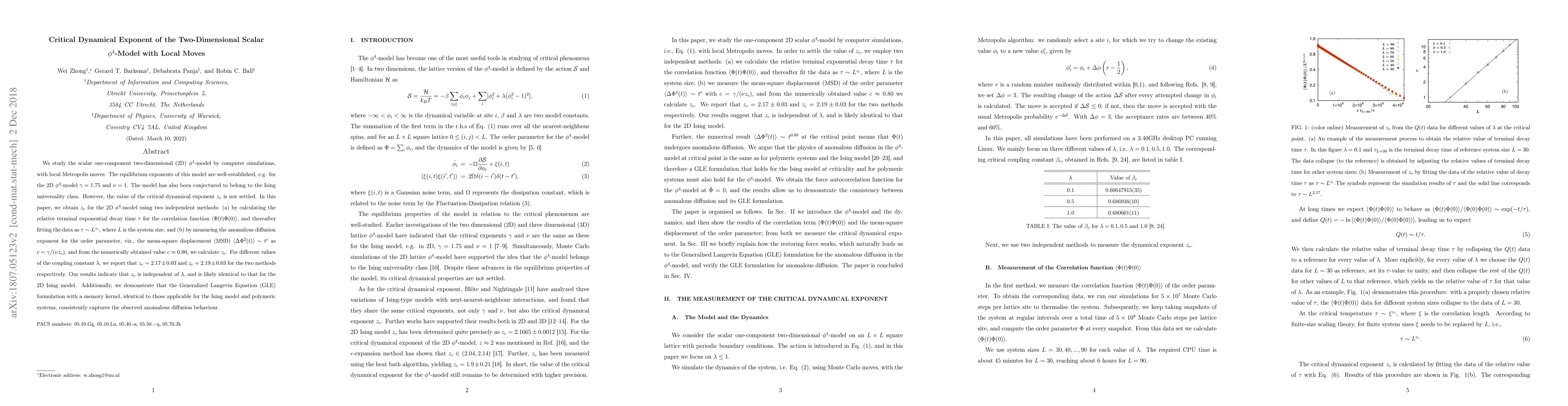 We study the scalar one-component two-dimensional (2D) $\phi^4$ model by computer simulations, with local Metropolis moves. The equilibrium exponents of this model are well-established, e.g. for the 2D $\phi^4$ model $\gamma= 1.75$ and $\nu= 1$. The model has also been conjectured to belong to the Ising universality class. However, the value of the critical dynamical exponent $z_c$ is not settled. In this paper, we obtain $z_c$ for the 2D $\phi^4$ model using two independent methods: (a) by calculating the relative terminal exponential decay time $\tau$ for the correlation function $\langle \phi(t)\phi(0)\rangle$, and thereafter fitting the data as $\tau \sim L^{z_c}$, where $L$ is the system size, and (b) by measuring the anomalous diffusion exponent for the order parameter, viz., the mean-square displacement (MSD) $\langle \Delta \phi^2(t)\rangle\sim t^c$ as $c=\gamma/(\nu z_c)$, and from the numerically obtained value $c\approx 0.80$, we calculate $z_c$. For different values of the coupling constant $\lambda$, we report that $z_c=2.17\pm0.03$ and $z_c=2.19\pm0.03$ for the two methods respectively. Our results indicate that $z_c$ is independent of $\lambda$, and is likely identical to that for the 2D Ising model. Additionally, we demonstrate that the Generalised Langevin Equation (GLE) formulation with a memory kernel, identical to those applicable for the Ising model and polymeric systems, consistently capture the observed anomalous diffusion behavior.