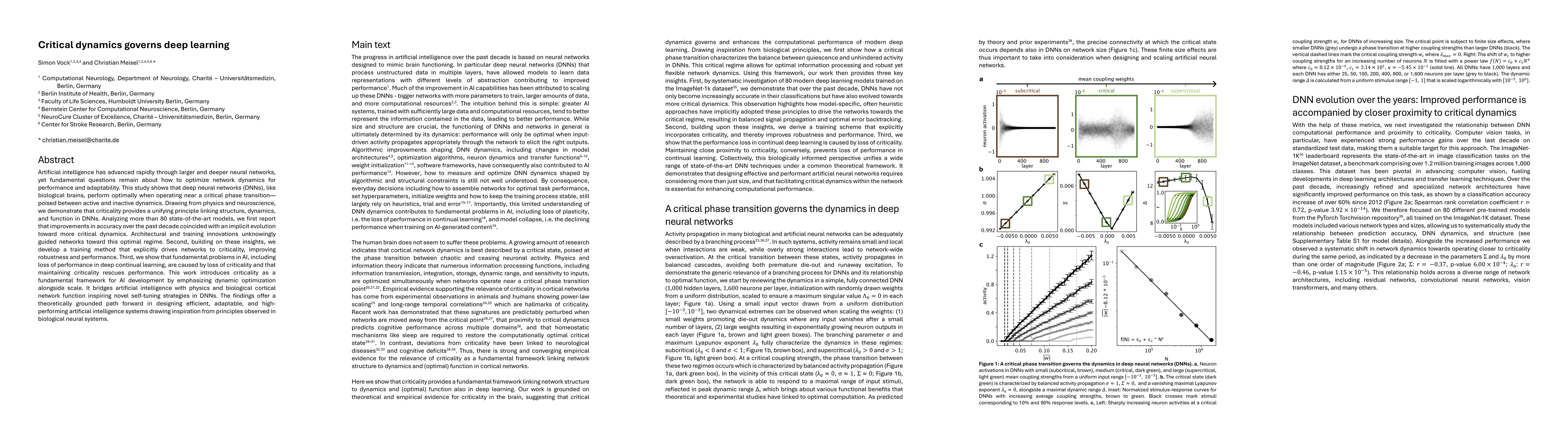 Artificial intelligence has advanced rapidly through larger and deeper neural networks, yet fundamental questions remain about how to optimize network dynamics for performance and adaptability. This study shows that deep neural networks (DNNs), like biological brains, perform optimally when operating near a critical phase transition - poised between active and inactive dynamics. Drawing from physics and neuroscience, we demonstrate that criticality provides a unifying principle linking structure, dynamics, and function in DNNs. Analyzing more than 80 state-of-the-art models, we first report that improvements in accuracy over the past decade coincided with an implicit evolution toward more critical dynamics. Architectural and training innovations unknowingly guided networks toward this optimal regime. Second, building on these insights, we develop a training method that explicitly drives networks to criticality, improving robustness and performance. Third, we show that fundamental problems in AI, including loss of performance in deep continual learning, are caused by loss of criticality and that maintaining criticality rescues performance. This work introduces criticality as a fundamental framework for AI development by emphasizing dynamic optimization alongside scale. It bridges artificial intelligence with physics and biological cortical network function inspiring novel self-tuning strategies in DNNs. The findings offer a theoretically grounded path forward in designing efficient, adaptable, and high-performing artificial intelligence systems drawing inspiration from principles observed in biological neural systems.