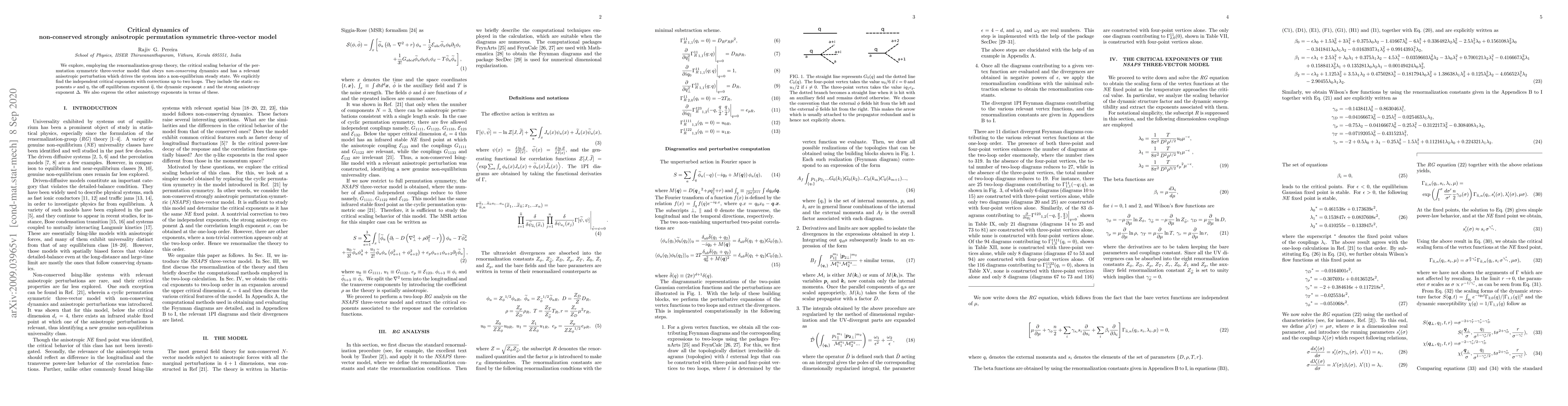 We explore, employing the renormalization-group theory, the critical scaling behavior of the permutation symmetric three-vector model that obeys non-conserving dynamics and has a relevant anisotropic perturbation which drives the system into a non-equilibrium steady state. We explicitly find the independent critical exponents with corrections up to two loops. They include the static exponents $\nu$ and $\eta$, the off equilibrium exponent $\widetilde{\eta}$, the dynamic exponent $z$ and the strong anisotropy exponent $\Delta$. We also express the other anisotropy exponents in terms of these.