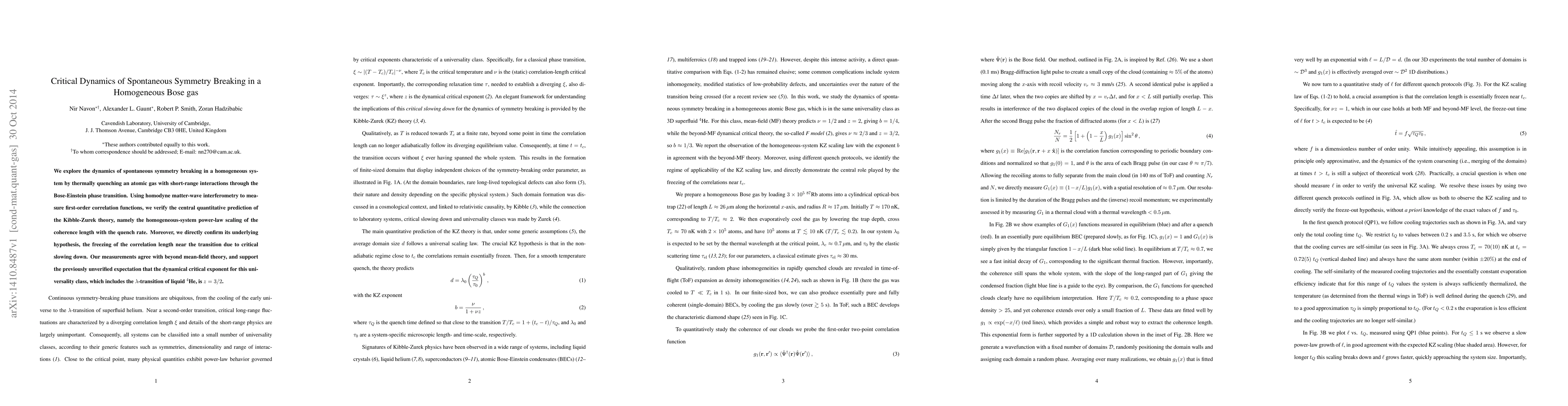 We explore the dynamics of spontaneous symmetry breaking in a homogeneous system by thermally quenching an atomic gas with short-range interactions through the Bose-Einstein phase transition. Using homodyne matter-wave interferometry to measure first-order correlation functions, we verify the central quantitative prediction of the Kibble-Zurek theory, namely the homogeneous-system power-law scaling of the coherence length with the quench rate. Moreover, we directly confirm its underlying hypothesis, the freezing of the correlation length near the transition due to critical slowing down. Our measurements agree with beyond mean-field theory, and support the previously unverified expectation that the dynamical critical exponent for this universality class, which includes the $\lambda$-transition of liquid $^4$He, is $z=3/2$.