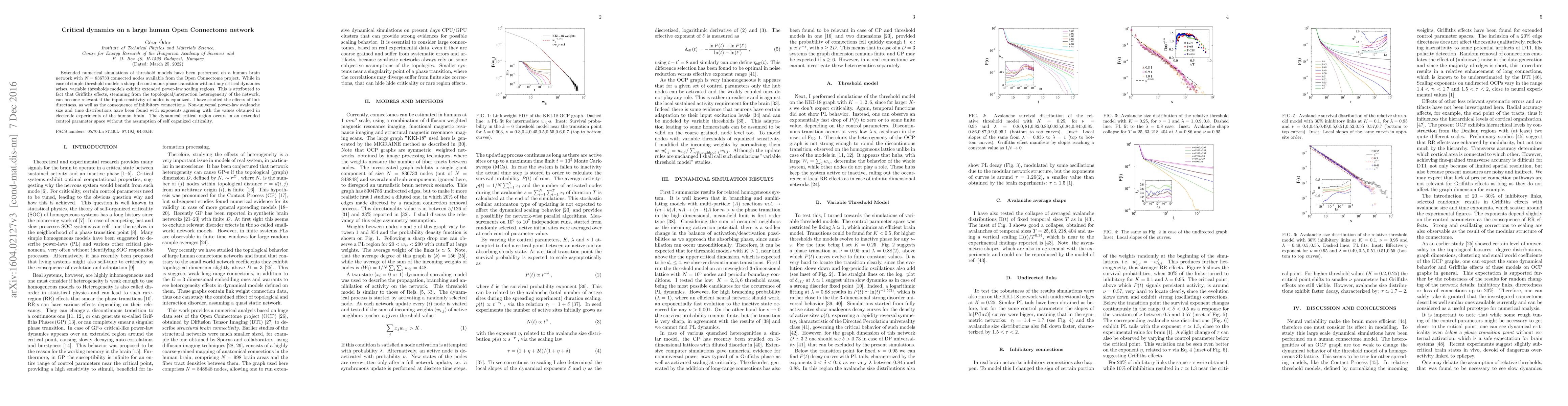 Extended numerical simulations of threshold models have been performed on a human brain network with N=836733 connected nodes available from the Open Connectome project. While in case of simple threshold models a sharp discontinuous phase transition without any critical dynamics arises, variable thresholds models exhibit extended power-law scaling regions. This is attributed to fact that Griffiths effects, stemming from the topological/interaction heterogeneity of the network, can become relevant if the input sensitivity of nodes is equalized. I have studied the effects effects of link directness, as well as the consequence of inhibitory connections. Non-universal power-law avalanche size and time distributions have been found with exponents agreeing with the values obtained in electrode experiments of the human brain. The dynamical critical region occurs in an extended control parameter space without the assumption of self organized criticality.