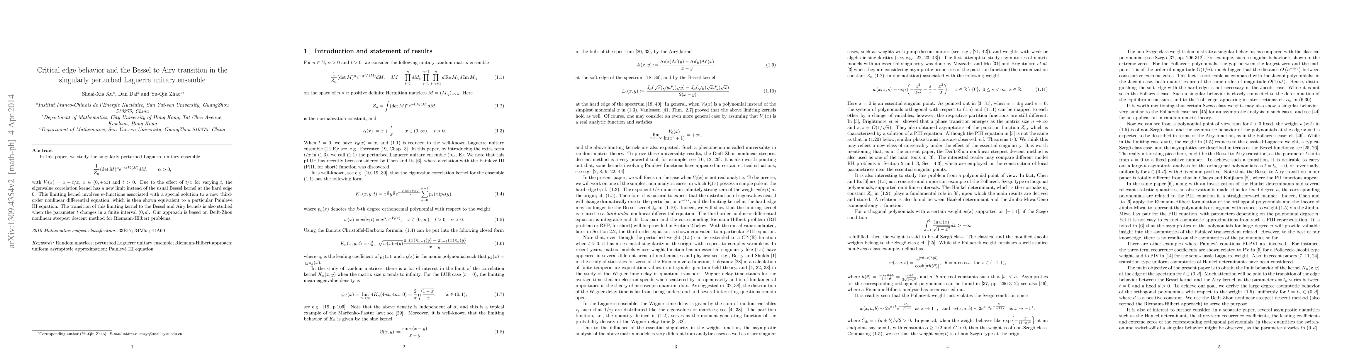 In this paper, we study the singularly perturbed Laguerre unitary ensemble $$ \frac{1}{Z_n} (\det M)^\alpha e^{- \textrm{tr}\, V_t(M)}dM, \qquad \alpha >0, $$ with $V_t(x) = x + t/x$, $x\in (0,+\infty)$ and $t>0$. Due to the effect of $t/x$ for varying $t$, the eigenvalue correlation kernel has a new limit instead of the usual Bessel kernel at the hard edge 0. This limiting kernel involves $\psi$-functions associated with a special solution to a new third-order nonlinear differential equation, which is then shown equivalent to a particular Painlev\'e III equation. The transition of this limiting kernel to the Bessel and Airy kernels is also studied when the parameter $t$ changes in a finite interval $(0, d]$. Our approach is based on Deift-Zhou nonlinear steepest descent method for Riemann-Hilbert problems.