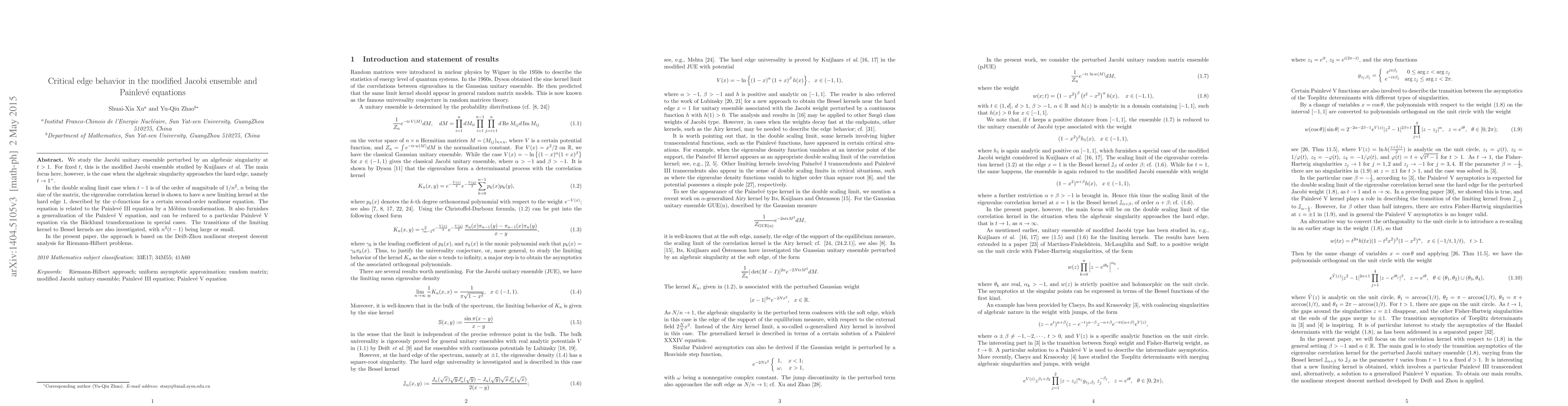 We study the Jacobi unitary ensemble perturbed by an algebraic singularity at $t>1$. For fixed $t$, this is the modified Jacobi ensemble studied by Kuijlaars {\it{et al.}} The main focus here, however, is the case when the algebraic singularity approaches the hard edge, namely $t\to 1^+$. In the double scaling limit case when $t- 1$ is of the order of magnitude of $1/n^2$, $n$ being the size of the matrix, the eigenvalue correlation kernel is shown to have a new limiting kernel at the hard edge $1$, described by the $\psi$-functions for a certain second-order nonlinear equation. The equation is related to the Painlev\'e III equation by a M\"obius transformation. It also furnishes a generalization of the Painlev\'e V equation, and can be reduced to a particular Painlev\'e V equation via the B\"acklund transformations in special cases. The transitions of the limiting kernel to Bessel kernels are also investigated, with $n^2(t-1)$ being large or small. In the present paper, the approach is based on the Deift-Zhou nonlinear steepest descent analysis for Riemann-Hilbert problems.