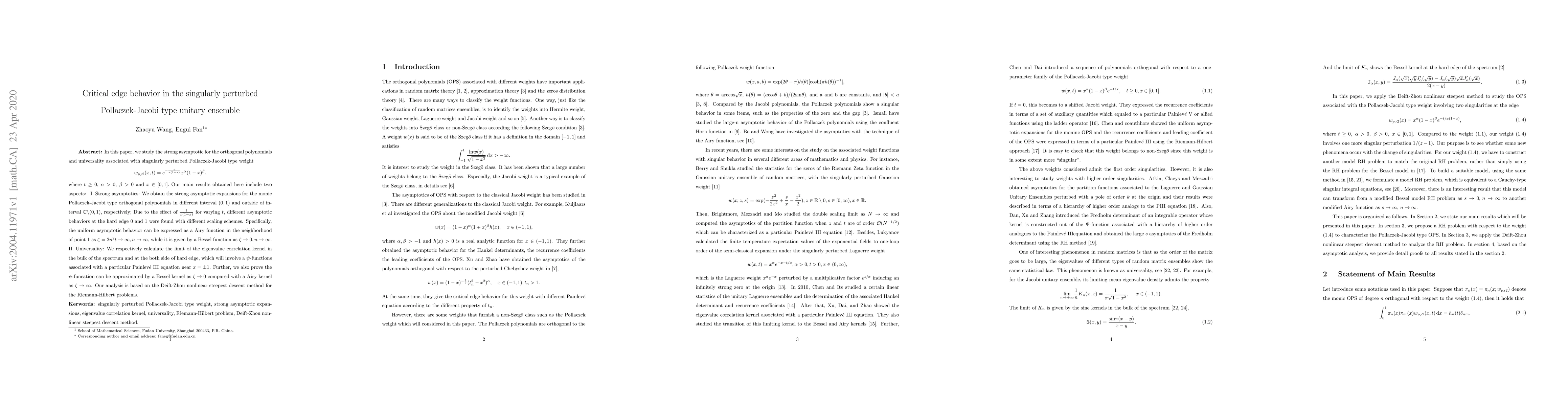 In this paper, we study the strong asymptotic for the orthogonal polynomials and universality associated with singularly perturbed Pollaczek-Jacobi type weight $$w_{p_J2}(x,t)=e^{-\frac{t}{x(1-x)}}x^\alpha(1-x)^\beta, $$ where $t \ge 0$, $\alpha >0$, $\beta >0$ and $x \in [0,1].$ Our main results obtained here include two aspects: { I. Strong asymptotics:} We obtain the strong asymptotic expansions for the monic Pollaczek-Jacobi type orthogonal polynomials in different interval $(0,1)$ and outside of interval $\mathbb{C}\backslash (0,1)$, respectively; Due to the effect of $\frac{t}{x(1-x)}$ for varying $t$, different asymptotic behaviors at the hard edge $0$ and $1$ were found with different scaling schemes. Specifically, the uniform asymptotic behavior can be expressed as a Airy function in the neighborhood of point $1$ as $\zeta= 2n^2t \to \infty, n\to \infty$, while it is given by a Bessel function as $\zeta \to 0, n \to \infty$. { II. Universality:} We respectively calculate the limit of the eigenvalue correlation kernel in the bulk of the spectrum and at the both side of hard edge, which will involve a $\psi$-functions associated with a particular Painlev$\acute{e}$ \uppercase\expandafter{\romannumeral3} equation near $x=\pm 1$. Further, we also prove the $\psi$-funcation can be approximated by a Bessel kernel as $\zeta \to 0$ compared with a Airy kernel as $\zeta \to \infty$. Our analysis is based on the Deift-Zhou nonlinear steepest descent method for the Riemann-Hilbert problems.
