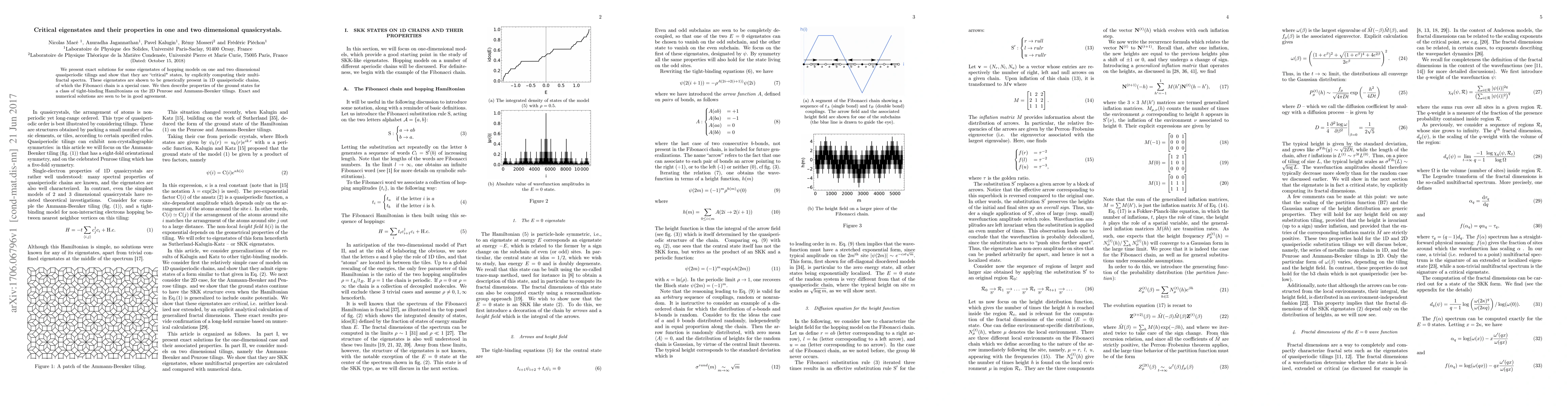 We present exact solutions for some eigenstates of hopping models on one and two dimensional quasiperiodic tilings and show that they are "critical" states, by explicitly computing their multifractal spectra. These eigenstates are shown to be generically present in 1D quasiperiodic chains, of which the Fibonacci chain is a special case. We then describe properties of the ground states for a class of tight-binding Hamiltonians on the 2D Penrose and Ammann-Beenker tilings. Exact and numerical solutions are seen to be in good agreement.