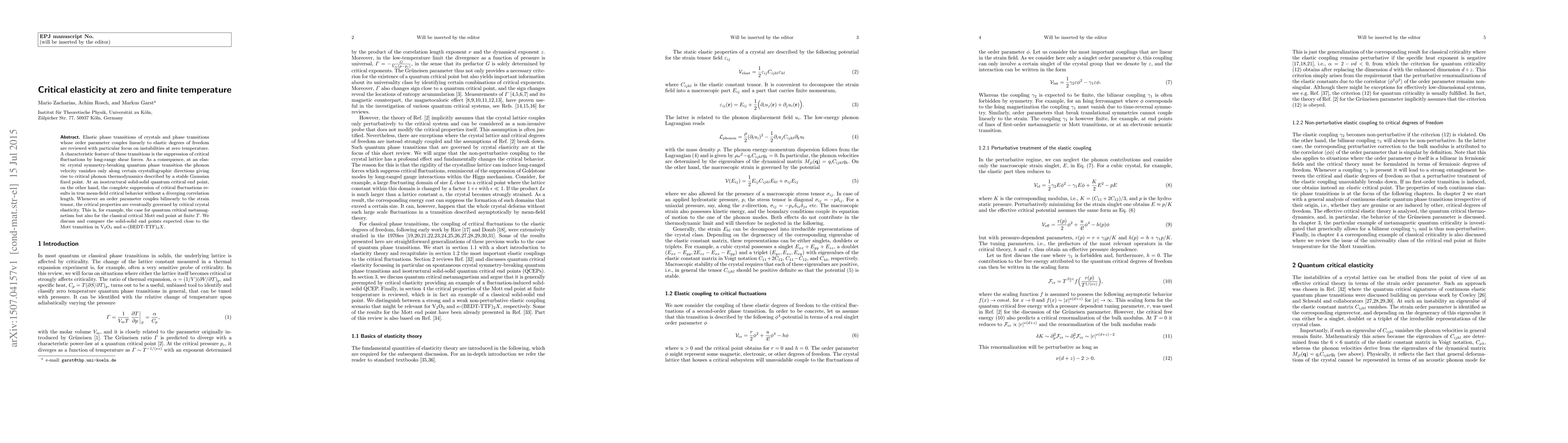 This paper reviews elastic phase transitions in crystals, focusing on zero-temperature quantum phase transitions where critical fluctuations are suppressed by long-range shear forces, leading to unique phonon behavior and Gaussian fixed points. It also discusses finite-temperature critical phenomena governed by critical crystal elasticity, comparing solid-solid end points near the Mott transition in V$_2$O$_3$ and $\kappa$-(BEDT-TTF)$_2$X.