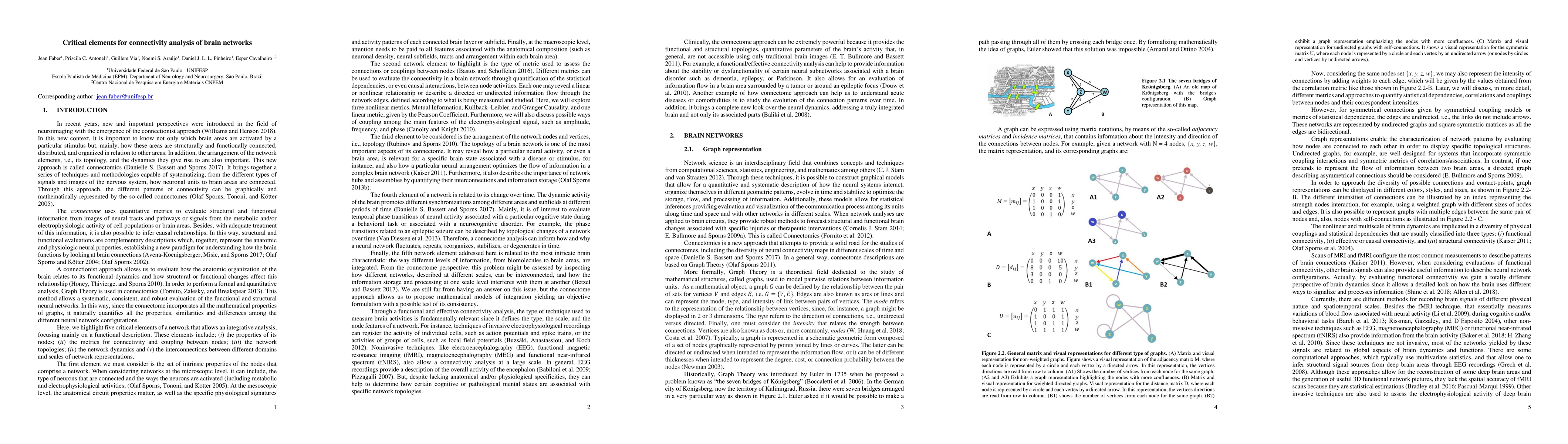 In recent years, new and important perspectives were introduced in the field of neuroimaging with the emergence of the connectionist approach. In this new context, it is important to know not only which brain areas are activated by a particular stimulus but, mainly, how these areas are structurally and functionally connected, distributed, and organized in relation to other areas. Additionally, the arrangement of the network elements, i.e., its topology, and the dynamics they give rise to are also important. This new approach is called connectomics. It brings together a series of techniques and methodologies capable of systematizing, from the different types of signals and images of the nervous system, how neuronal units to brain areas are connected. Through this approach, the different patterns of connectivity can be graphically and mathematically represented by the so-called connectomes. The connectome uses quantitative metrics to evaluate structural and functional information from images of neural tracts and pathways or signals from the metabolic and/or electrophysiologic activity of cell populations or brain areas. Besides, with adequate treatment of this information, it is also possible to infer causal relationships. In this way, structural and functional evaluations are complementary descriptions which, together, represent the anatomic and physiologic neural properties, establishing a new paradigm for understanding how the brain functions by looking at brain connections. Here, we highlight five critical elements of a network that allows an integrative analysis, focusing mainly on a functional description. These elements include; (i) the properties of its nodes; (ii) the metrics for connectivity and coupling between nodes; (iii) the network topologies; (iv) the network dynamics and (v) the interconnections between different domains and scales of network representations.