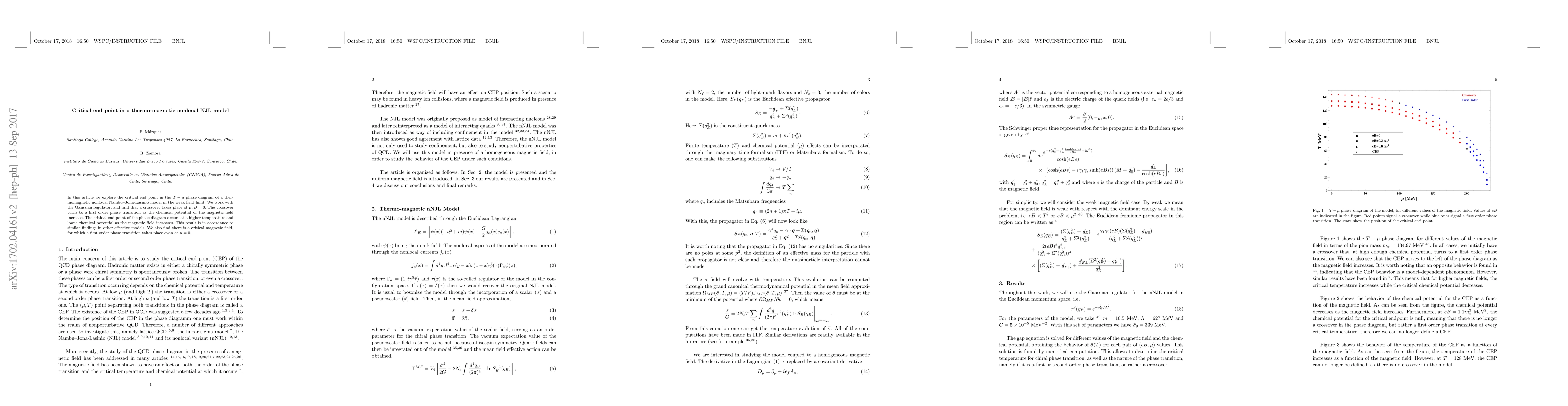 In this article we explore the critical end point in the $T-\mu$ phase diagram of a thermomagnetic nonlocal Nambu--Jona-Lasinio model in the weak field limit. We work with the Gaussian regulator, and find that a crossover takes place at $\mu, B=0$. The crossover turns to a first order phase transition as the chemical potential or the magnetic field increase. The critical end point of the phase diagram occurs at a higher temperature and lower chemical potential as the magnetic field increases. This result is in accordance to similar findings in other effective models. We also find there is a critical magnetic field, for which a first order phase transition takes place even at $\mu=0$.