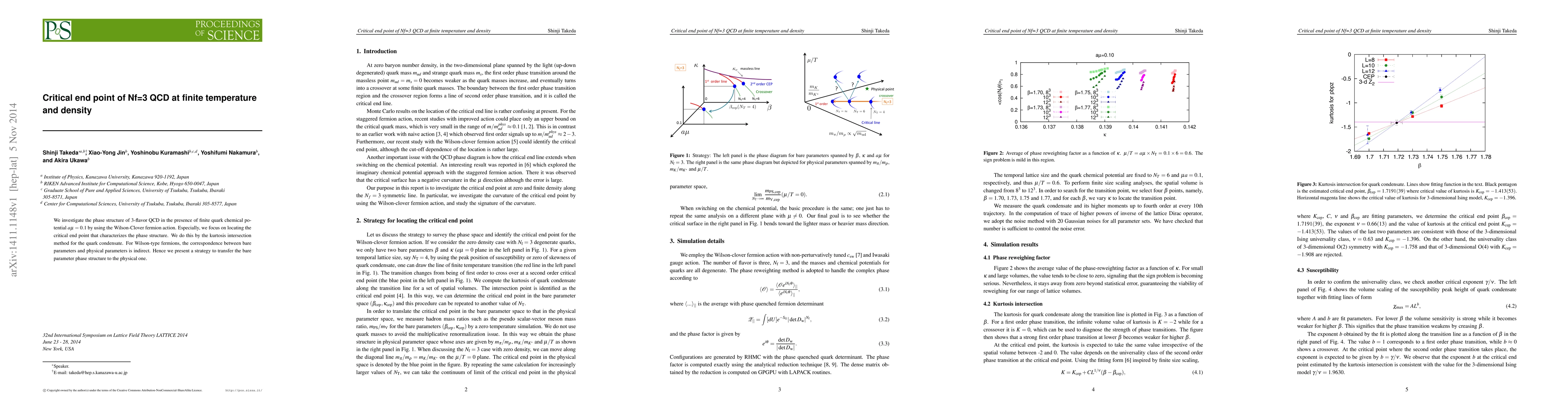 This study explores the phase structure of 3-flavor QCD at finite temperature and density, focusing on identifying the critical end point using the Wilson-Clover fermion action and the kurtosis intersection method for the quark condensate. It also presents a strategy to translate the bare parameter phase structure to physical parameters.
