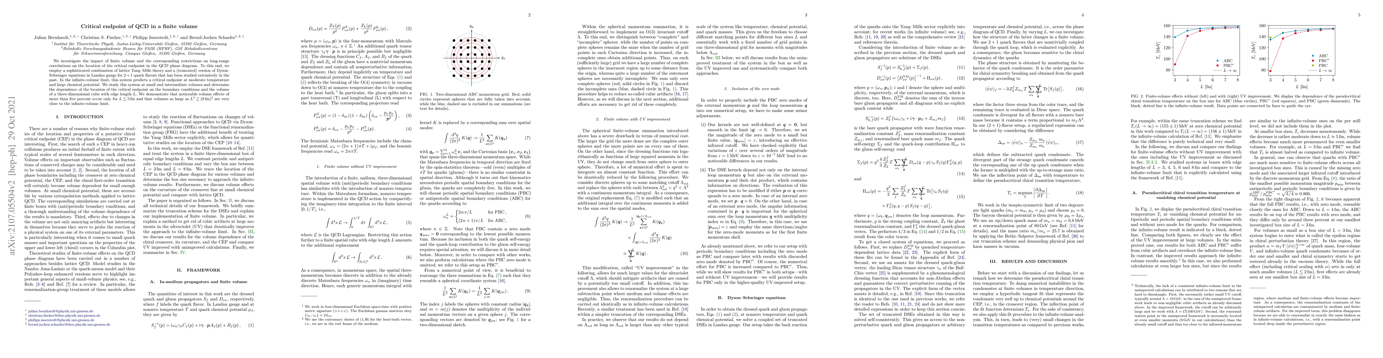 We investigate the impact of finite volume and the corresponding restrictions on long-range correlations on the location of the critical endpoint in the QCD phase diagram. To this end, we employ a sophisticated combination of lattice Yang--Mills theory and a (truncated) version of Dyson--Schwinger equations in Landau gauge for $2 + 1$ quark flavors that has been studied extensively in the past. In the infinite-volume limit, this system predicts a critical endpoint at moderate temperature and large chemical potential. We study this system at small and intermediate volumes and determine the dependence of the location of the critical endpoint on the boundary conditions and the volume of a three-dimensional cube with edge length $L$. We demonstrate that noticeable volume effects of more than five percent only occur for $L \lesssim 5 \, \text{fm}$ and that volumes as large as $L^3 \gtrsim (8 \, \text{fm})^3$ are very close to the infinite-volume limit.