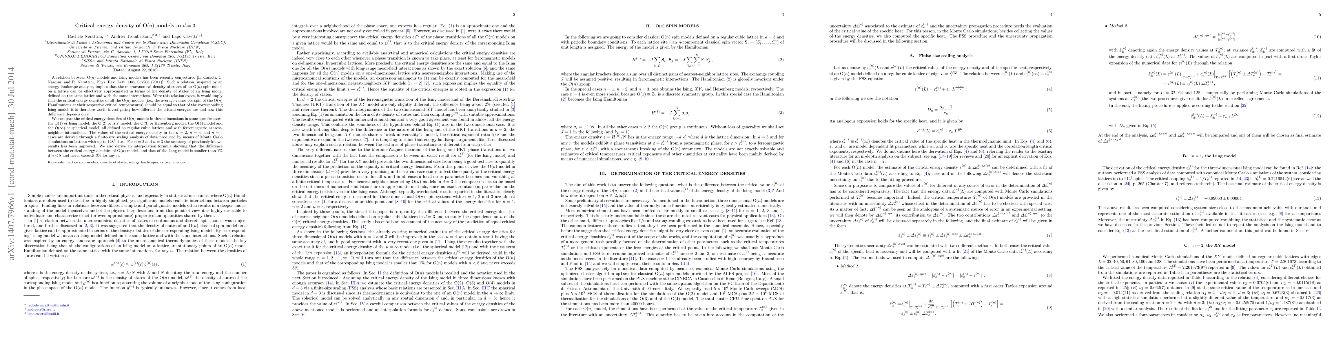 A relation between O$(n)$ models and Ising models has been recently conjectured [L. Casetti, C. Nardini, and R. Nerattini, Phys. Rev. Lett. 106, 057208 (2011)]. Such a relation, inspired by an energy landscape analysis, implies that the microcanonical density of states of an O$(n)$ spin model on a lattice can be effectively approximated in terms of the density of states of an Ising model defined on the same lattice and with the same interactions. Were this relation exact, it would imply that the critical energy densities of all the O$(n)$ models (i.e., the average values per spin of the O$(n)$ Hamiltonians at their respective critical temperatures) should be equal to that of the corresponding Ising model; it is therefore worth investigating how different the critical energies are and how this difference depends on $n$. We compare the critical energy densities of O$(n)$ models in three dimensions in some specific cases: the O$(1)$ or Ising model, the O$(2)$ or $XY$ model, the O$(3)$ or Heisenberg model, the O$(4)$ model and the O$(\infty)$ or spherical model, all defined on regular cubic lattices and with ferromagnetic nearest-neighbor interactions. The values of the critical energy density in the $n=2$, $n=3$, and $n=4$ cases are derived through a finite-size scaling analysis of data produced by means of Monte Carlo simulations on lattices with up to $128^3$ sites. For $n=2$ and $n=3$ the accuracy of previously known results has been improved. We also derive an interpolation formula showing that the difference between the critical energy densities of O$(n)$ models and that of the Ising model is smaller than $1\%$ if $n<8$ and never exceeds $3\%$ for any $n$.