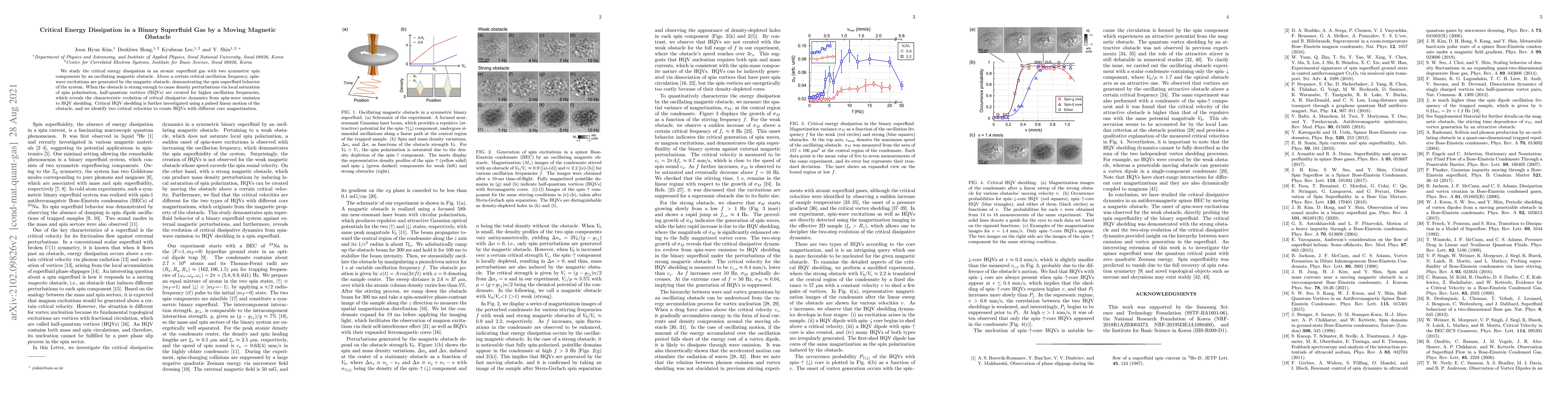 We study the critical energy dissipation in an atomic superfluid gas with two symmetric spin components by an oscillating magnetic obstacle. Above a certain critical oscillation frequency, spin-wave excitations are generated by the magnetic obstacle, demonstrating the spin superfluid behavior of the system. When the obstacle is strong enough to cause density perturbations via local saturation of spin polarization, half-quantum vortices (HQVs) are created for higher oscillation frequencies, which reveals the characteristic evolution of critical dissipative dynamics from spin-wave emission to HQV shedding. Critical HQV shedding is further investigated using a pulsed linear motion of the obstacle, and we identify two critical velocities to create HQVs with different core magnetization.