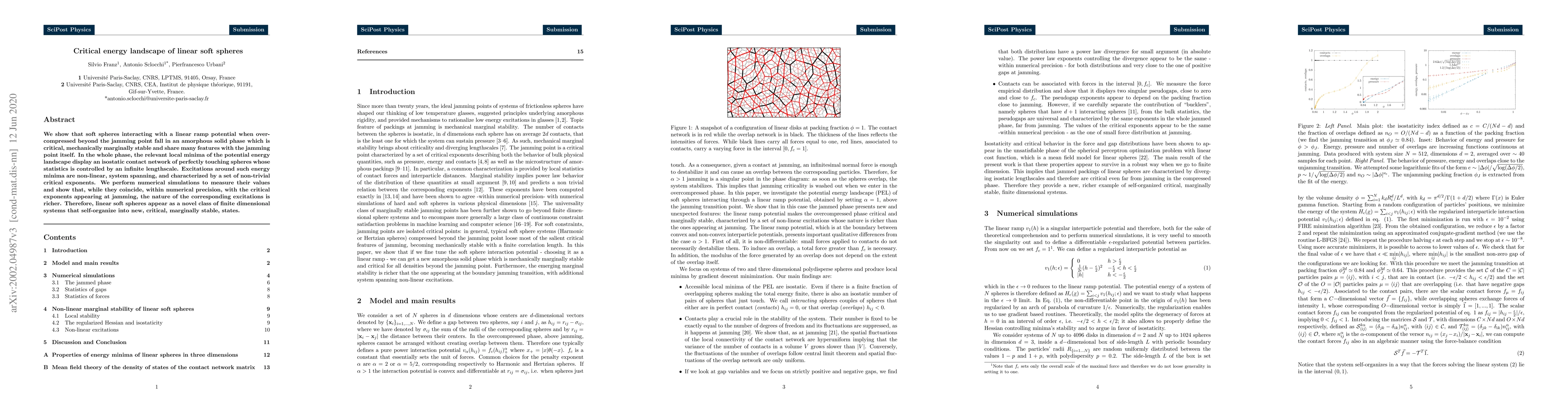 We show that soft spheres interacting with a linear ramp potential when overcompressed beyond the jamming point fall in an amorphous solid phase which is critical, mechanically marginally stable and share many features with the jamming point itself. In the whole phase, the relevant local minima of the potential energy landscape display an isostatic contact network of perfectly touching spheres whose statistics is controlled by an infinite lengthscale. Excitations around such energy minima are non-linear, system spanning, and characterized by a set of non-trivial critical exponents. We perform numerical simulations to measure their values and show that, while they coincide, within numerical precision, with the critical exponents appearing at jamming, the nature of the corresponding excitations is richer. Therefore, linear soft spheres appear as a novel class of finite dimensional systems that self-organize into new, critical, marginally stable, states.