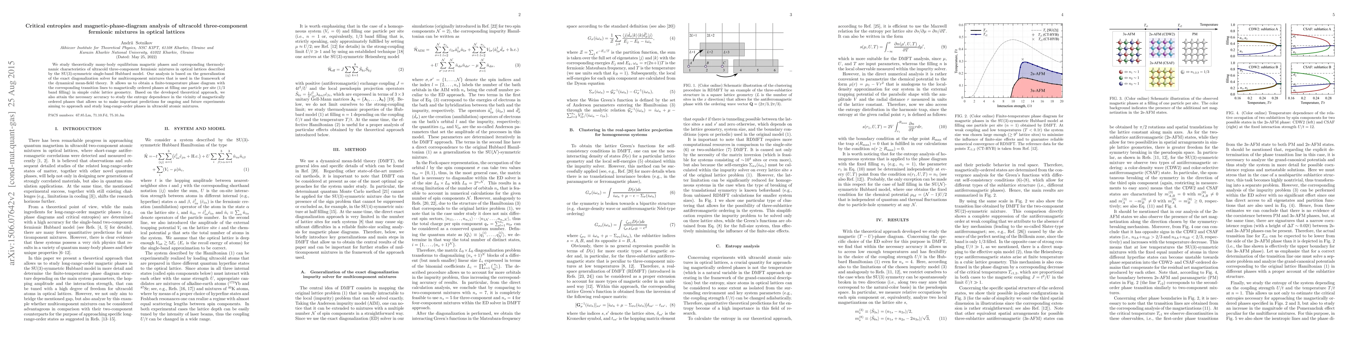 We study theoretically many-body equilibrium magnetic phases and corresponding thermodynamic characteristics of ultracold three-component fermionic mixtures in optical lattices described by the SU(3)-symmetric single-band Hubbard model. Our analysis is based on the generalization of the exact diagonalization solver for multicomponent mixtures that is used in the framework of the dynamical mean-field theory. It allows us to obtain a finite-temperature phase diagram with the corresponding transition lines to magnetically ordered phases at filling one particle per site (1/3 band filling) in simple cubic lattice geometry. Based on the developed theoretical approach, we also attain the necessary accuracy to study the entropy dependence in the vicinity of magnetically ordered phases that allows us to make important predictions for ongoing and future experiments aiming to approach and study long-range-order phases in ultracold atomic mixtures.