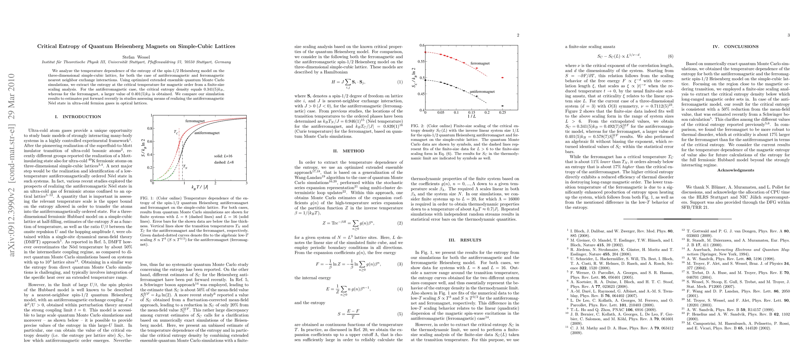 We analyze the temperature dependence of the entropy of the spin-1/2 Heisenberg model on the three-dimensional simple-cubic lattice, for both the case of antiferromagnetic and ferromagnetic nearest neighbor exchange interactions. Using optimized extended ensemble quantum Monte Carlo simulations, we extract the entropy at the critical temperature for magnetic order from a finite-size scaling analysis. For the antiferromagnetic case, the critical entropy density equals 0.341(5)$k_B$, whereas for the ferromagnet, a larger value of 0.401(5) $k_B$ is obtained. We compare our simulation results to estimates put forward recently in studies assessing means of realizing the antiferromagnetic N\'eel state in ultra-cold fermion gases in optical lattices.