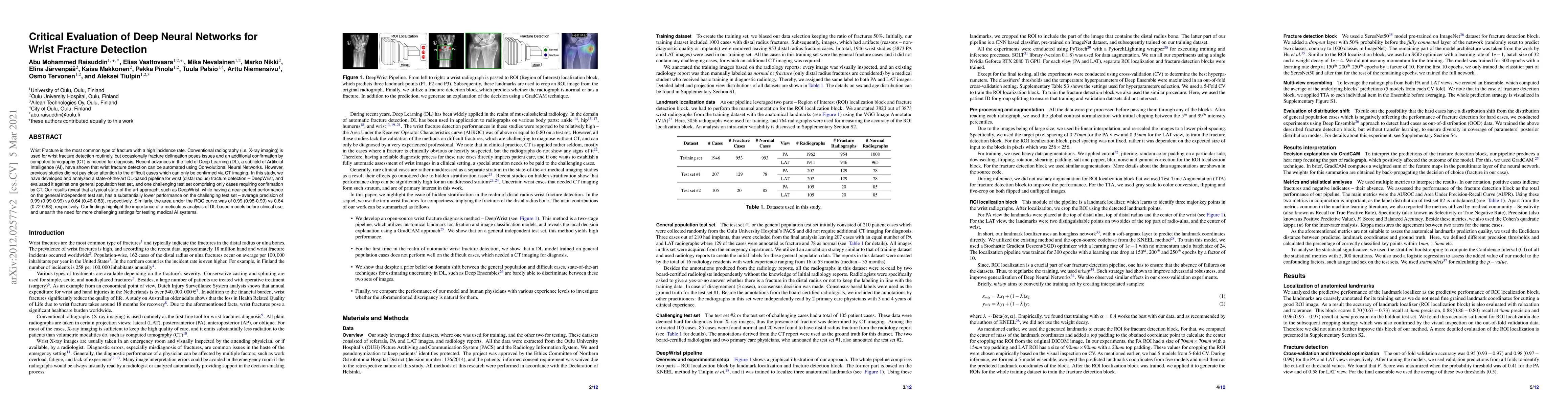 This study evaluates a deep learning model, DeepWrist, for detecting wrist fractures using convolutional neural networks, showing near-perfect performance on general cases but significantly lower precision on challenging CT-confirmed cases. The findings underscore the importance of rigorous testing of medical AI systems in diverse scenarios.