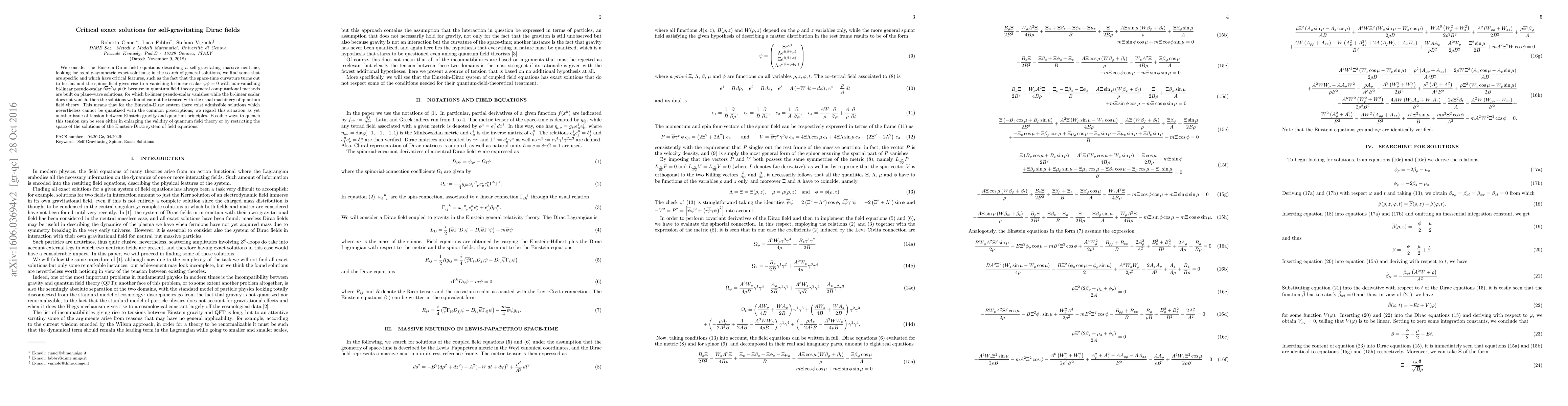 We consider the Einstein-Dirac field equations describing a self-gravitating massive neutrino, looking for axially-symmetric exact solutions; in the search of general solutions, we find some that are specific and which have critical features, such as the fact that the space-time curvature turns out to be flat and the spinor field gives rise to a vanishing bi-linear scalar $\overline{\psi}\psi=0$ with non-vanishing bi-linear pseudo-scalar $i\overline{\psi}\gamma^5\psi\not=0$: because in quantum field theory general computational methods are built on plane-wave solutions, for which bi-linear pseudo-scalar vanishes while the bi-linear scalar does not vanish, then the solutions we found cannot be treated with the usual machinery of quantum field theory. This means that for the Einstein-Dirac system there exist admissible solutions which nevertheless cannot be quantized with the common prescriptions; we regard this situation as yet another issue of tension between Einstein gravity and quantum principles. Possible ways to quench this tension can be seen either in enlarging the validity of quantum field theory or by restricting the space of the solutions of the Einstein-Dirac system of field equations.