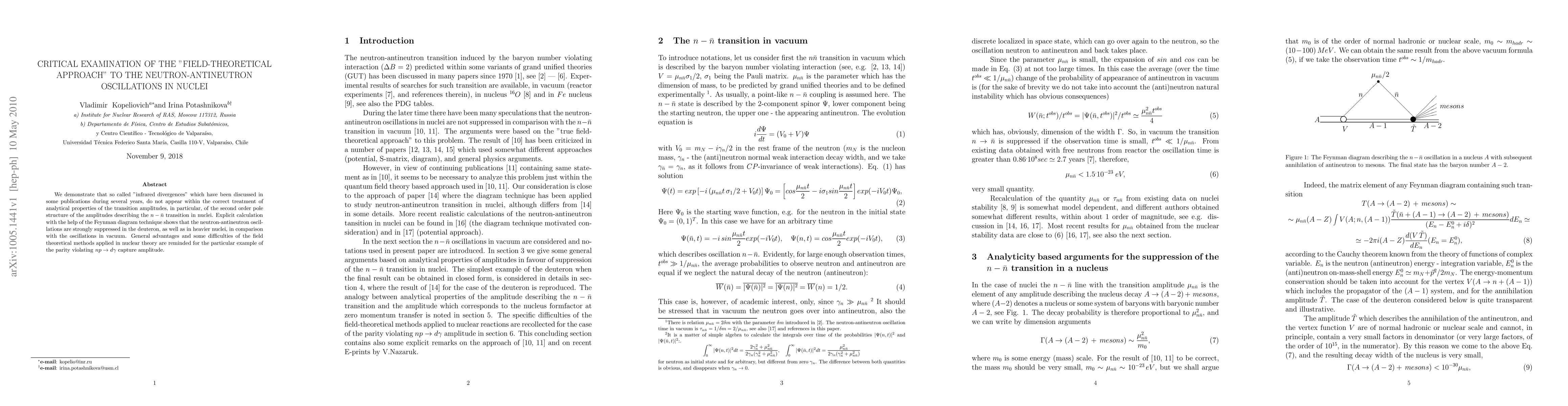We demonstrate that so called "infrared divergences" which have been discussed in some publications during several years, do not appear within the correct treatment of analytical properties of the transition amplitudes, in particular, of the second order pole structure of the amplitudes describing the $n - \bar n$ transition in nuclei. Explicit calculation with the help of the Feynman diagram technique shows that the neutron-antineutron oscillations are strongly suppressed in the deuteron, as well as in heavier nuclei, in comparison with the oscillations in vacuum. General advantages and some difficulties of the field theoretical methods applied in nuclear theory are reminded for the particular example of the parity violating $np\to d\gamma$ capture amplitude.