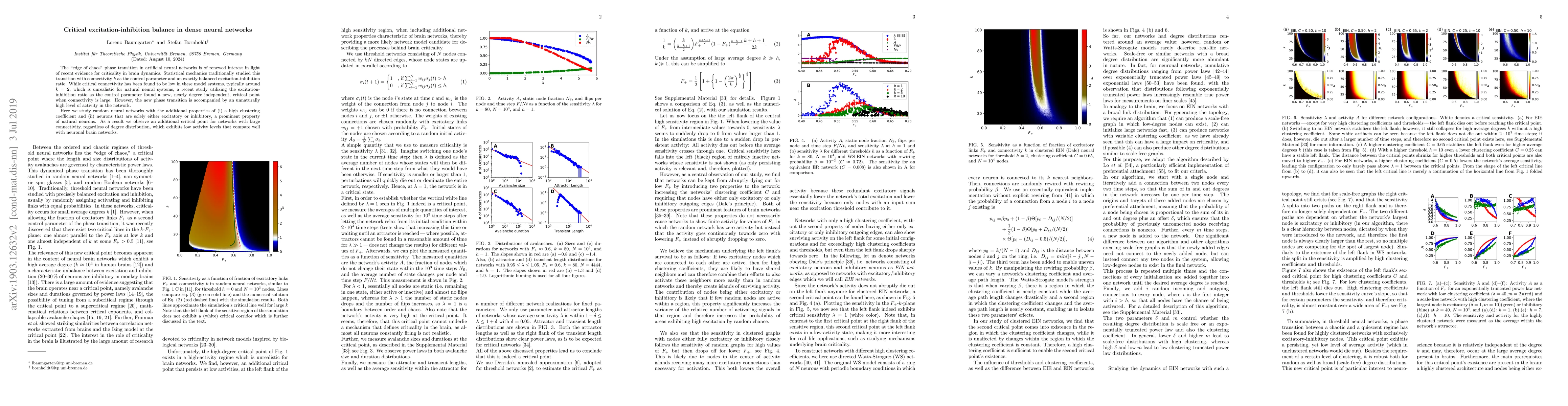 This paper investigates the critical excitation-inhibition balance in dense neural networks, finding a new critical point with low activity levels when networks have high clustering and neurons are strictly excitatory or inhibitory, resembling natural neural systems. This contrasts with previous models that showed high activity at criticality.
