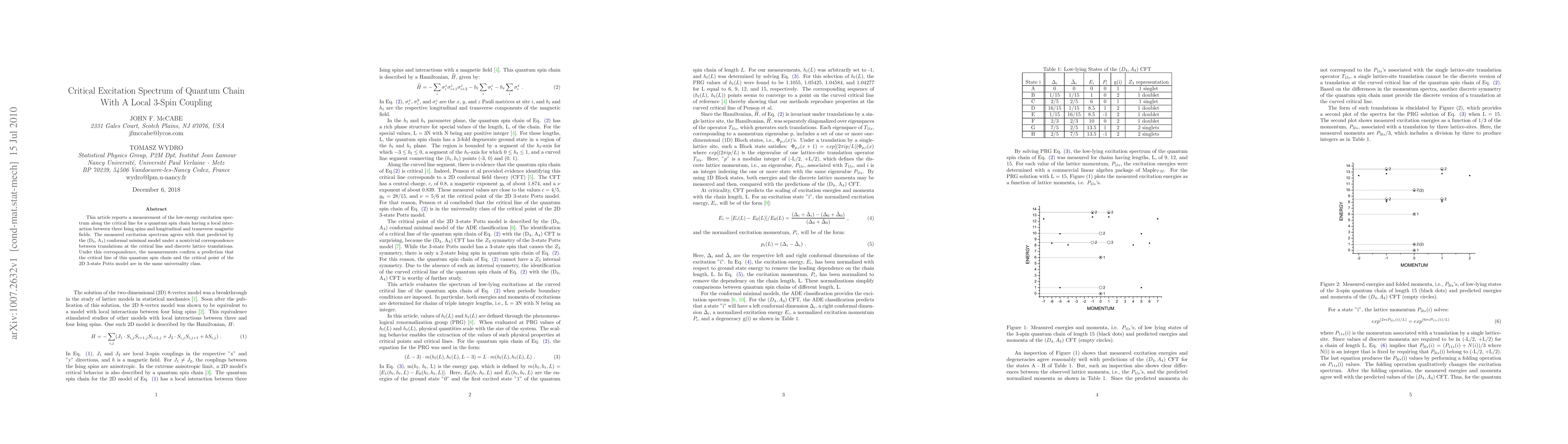 This study measures the low-energy excitation spectrum of a quantum spin chain with a local 3-spin interaction, finding agreement with predictions from the (D$_4$, A$_4$) conformal minimal model. The results confirm that the critical line of this quantum chain shares the same universality class as the critical point of the 2D 3-state Potts model.