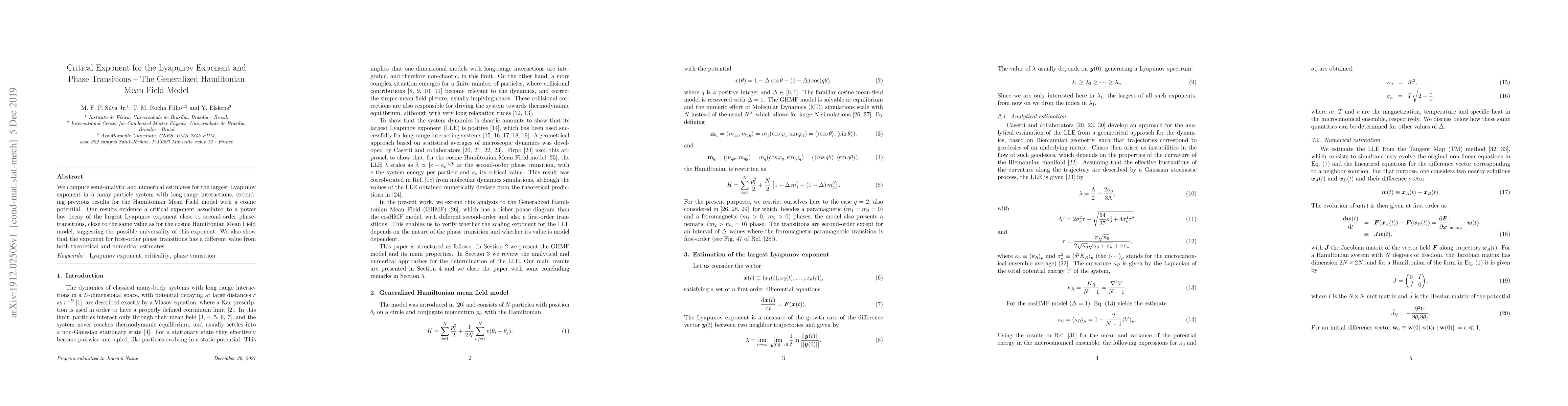 This paper computes the largest Lyapunov exponent in a many-particle system with long-range interactions, finding a critical exponent for its decay near second-order phase transitions, suggesting universality. It also identifies a distinct exponent for first-order phase transitions.