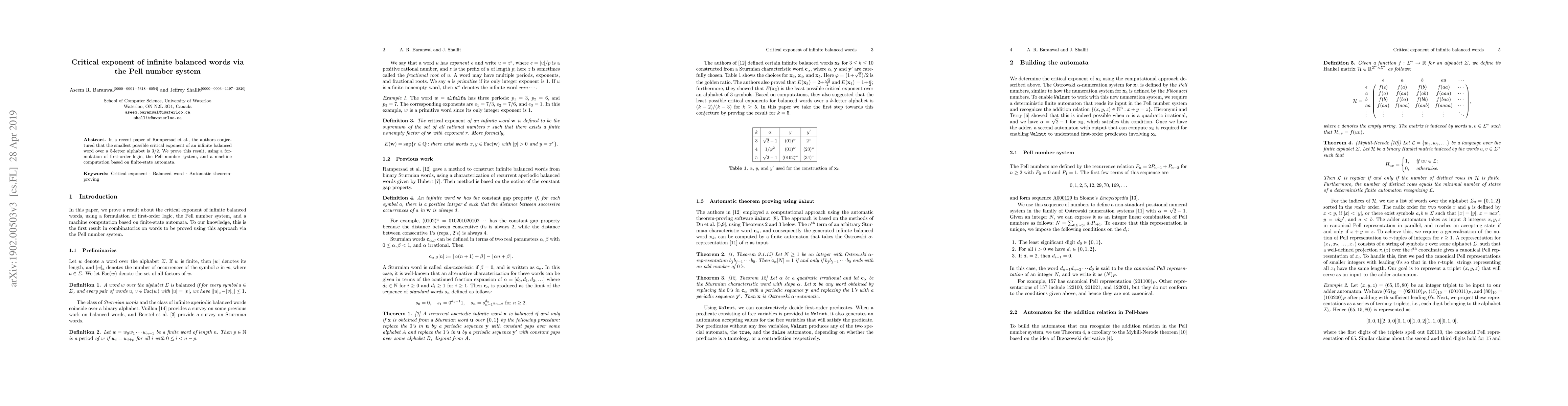 In a recent paper of Rampersad et al., the authors conjectured that the smallest possible critical exponent of an infinite balanced word over a 5-letter alphabet is $3/2$. We prove this result, using a formulation of first-order logic, the Pell number system, and a machine computation based on finite-state automata.