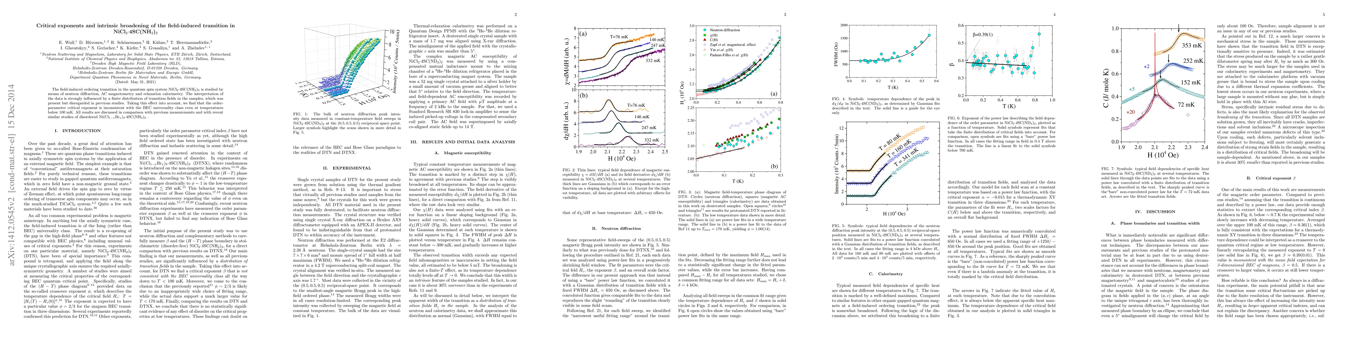 This study investigates the field-induced ordering transition in NiCl$_2$$\cdot$4SC(NH$_2$)$_2$ using neutron diffraction, AC magnetometry, and relaxation calorimetry, revealing that intrinsic broadening due to a distribution of transition fields affects the critical exponent, which does not conform to the BEC universality class even at low temperatures. The findings are compared with previous and similar studies on disordered Ni(Cl$_{1-x}$Br$_x$)$_2$$\cdot$4SC(NH$_2$)$_2$.