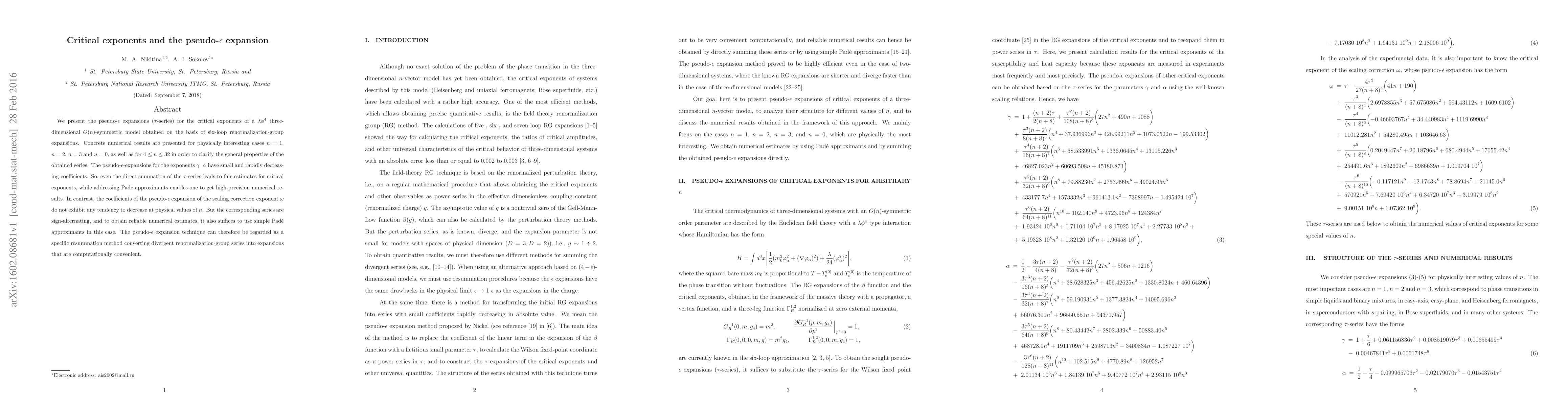 We present the pseudo-$\epsilon$ expansions ($\tau$-series) for the critical exponents of a $\lambda\phi^4$ three-dimensional $O(n)$-symmetric model obtained on the basis of six-loop renormalization-group expansions. Concrete numerical results are presented for physically interesting cases $n = 1$, $n = 2$, $n = 3$ and $n = 0$, as well as for $4 \le n \le 32$ in order to clarify the general properties of the obtained series. The pseudo-$\epsilon$-expansions for the exponents $\gamma$ and $\alpha$ have small and rapidly decreasing coefficients. So, even the direct summation of the $\tau$-series leads to fair estimates for critical exponents, while addressing Pade approximants enables one to get high-precision numerical results. In contrast, the coefficients of the pseudo-$\epsilon$ expansion of the scaling correction exponent $\omega$ do not exhibit any tendency to decrease at physical values of $n$. But the corresponding series are sign-alternating, and to obtain reliable numerical estimates, it also suffices to use simple Pad\'e approximants in this case. The pseudo-$\epsilon$ expansion technique can therefore be regarded as a specific resummation method converting divergent renormalization-group series into expansions that are computationally convenient.