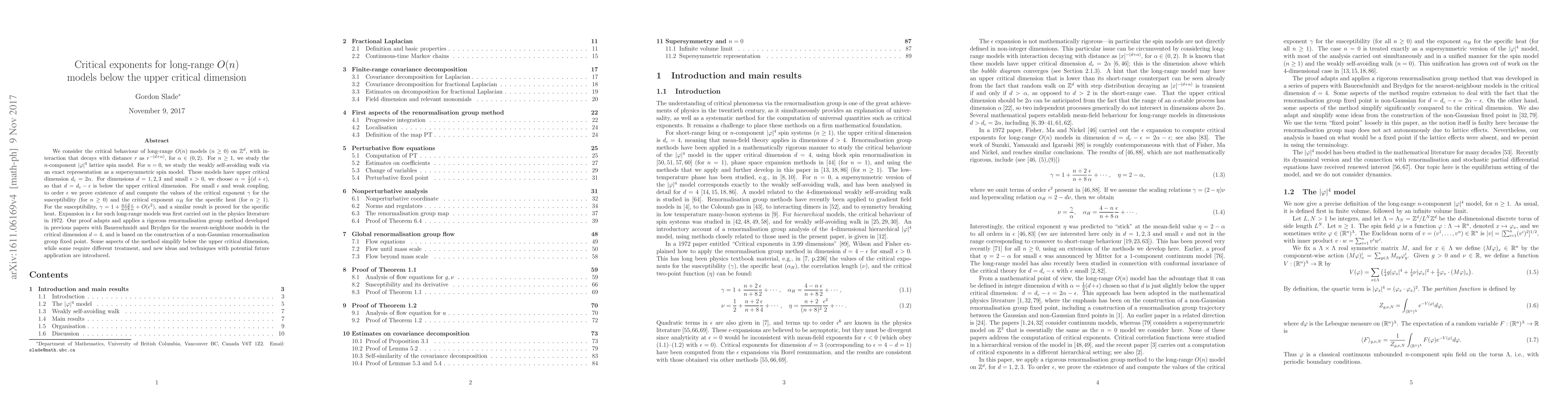 This paper investigates the critical behavior of long-range $O(n)$ models below their upper critical dimension, computing critical exponents $\gamma$ for susceptibility and $\alpha_H$ for specific heat to order $\epsilon$ for small $\epsilon$. The study employs a rigorous renormalisation group method adapted from previous work on nearest-neighbour models.