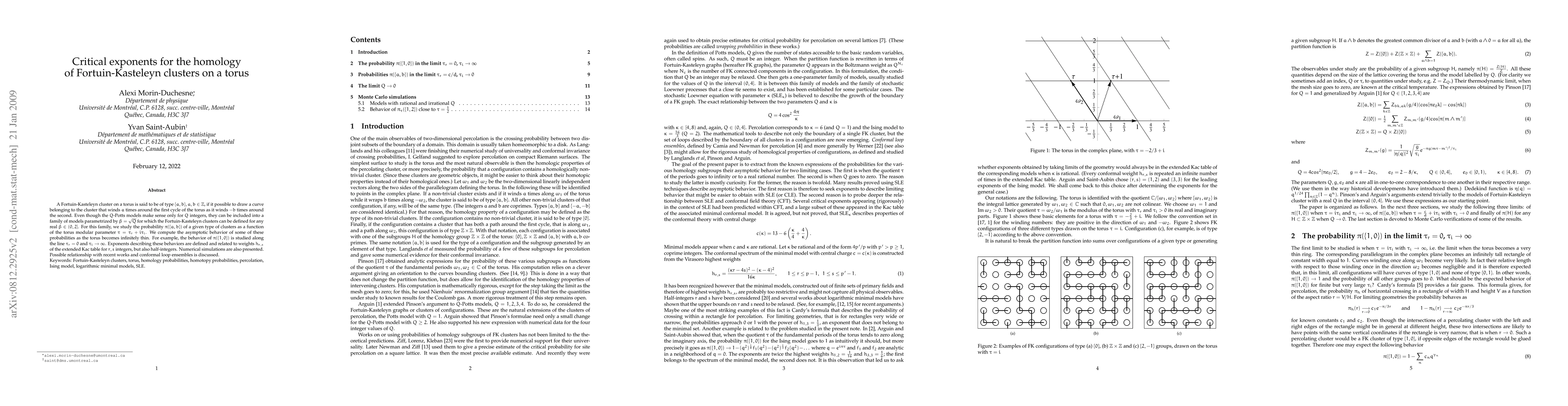 This paper investigates the critical exponents for the homology of Fortuin-Kasteleyn clusters on a torus, focusing on the probability of specific cluster types as a function of the torus's modular parameter. It computes the asymptotic behavior of these probabilities as the torus becomes infinitely thin, relating the exponents to weights from the extended Kac table and discussing potential connections to conformal loop ensembles.