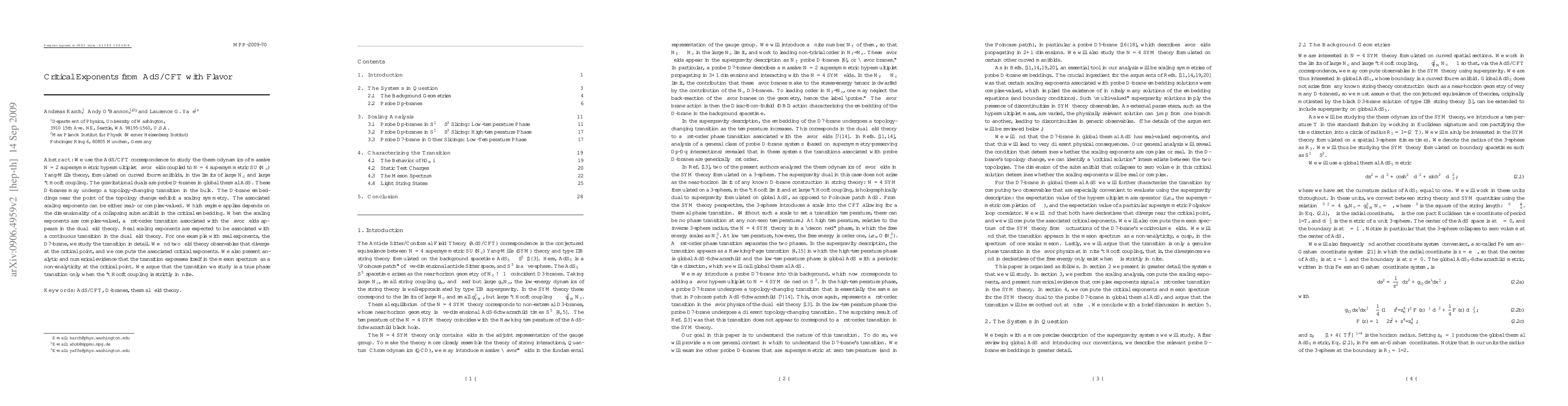 This paper uses the AdS/CFT correspondence to investigate the thermodynamics of flavor fields in N=4 supersymmetric Yang-Mills theory, finding that scaling exponents determine whether transitions are first-order or continuous. For a D7-brane example, the study reveals two diverging field theory observables and computes critical exponents, indicating a phase transition only at infinite 't Hooft coupling.