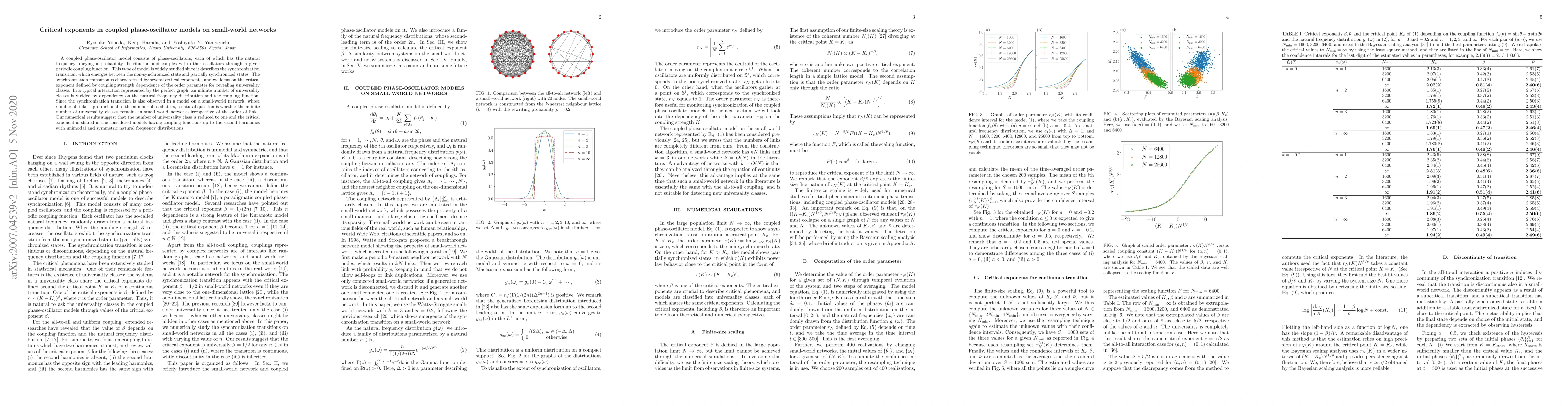 A coupled phase-oscillator model consists of phase-oscillators, each of which has the natural frequency obeying a probability distribution and couples with other oscillators through a given periodic coupling function. This type of model is widely studied since it describes the synchronization transition, which emerges between the non-synchronized state and partially synchronized states. The synchronization transition is characterized by several critical exponents, and we focus on the critical exponent defined by coupling strength dependence of the order parameter for revealing universality classes. In a typical interaction represented by the perfect graph, an infinite number of universality classes is yielded by dependency on the natural frequency distribution and the coupling function. Since the synchronization transition is also observed in a model on a small-world network, whose number of links is proportional to the number of oscillators, a natural question is whether the infinite number of universality classes remains in small-world networks irrespective of the order of links. Our numerical results suggest that the number of universality class is reduced to one and the critical exponent is shared in the considered models having coupling functions up to the second harmonics with unimodal and symmetric natural frequency distributions.