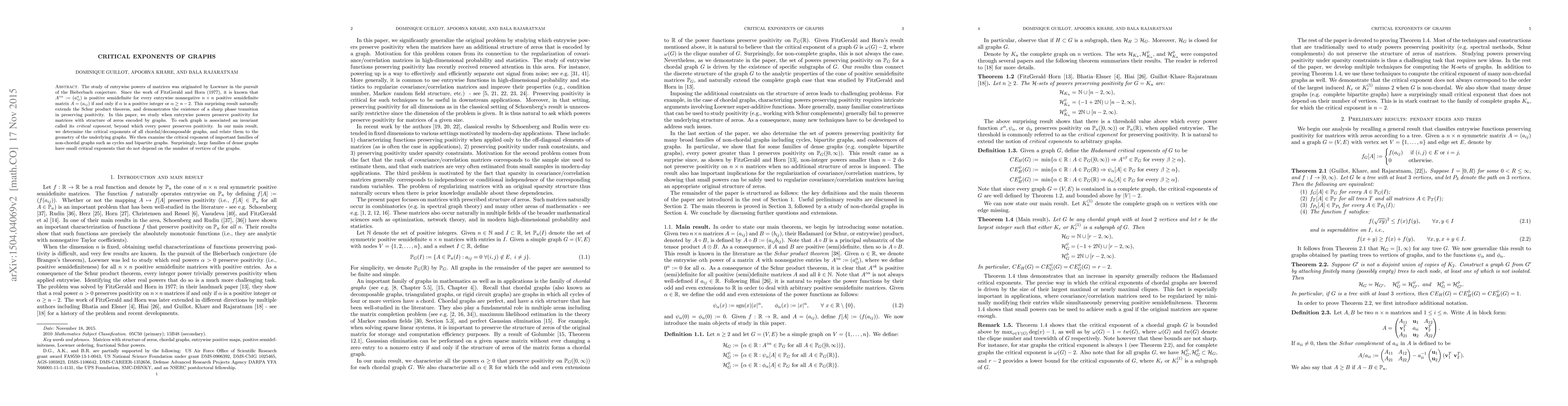 The study of entrywise powers of matrices was originated by Loewner in the pursuit of the Bieberbach conjecture. Since the work of FitzGerald and Horn (1977), it is known that $A^{\circ \alpha} := (a_{ij}^\alpha)$ is positive semidefinite for every entrywise nonnegative $n \times n$ positive semidefinite matrix $A = (a_{ij})$ if and only if $\alpha$ is a positive integer or $\alpha \geq n-2$. This surprising result naturally extends the Schur product theorem, and demonstrates the existence of a sharp phase transition in preserving positivity. In this paper, we study when entrywise powers preserve positivity for matrices with structure of zeros encoded by graphs. To each graph is associated an invariant called its "critical exponent", beyond which every power preserves positivity. In our main result, we determine the critical exponents of all chordal/decomposable graphs, and relate them to the geometry of the underlying graphs. We then examine the critical exponent of important families of non-chordal graphs such as cycles and bipartite graphs. Surprisingly, large families of dense graphs have small critical exponents that do not depend on the number of vertices of the graphs.