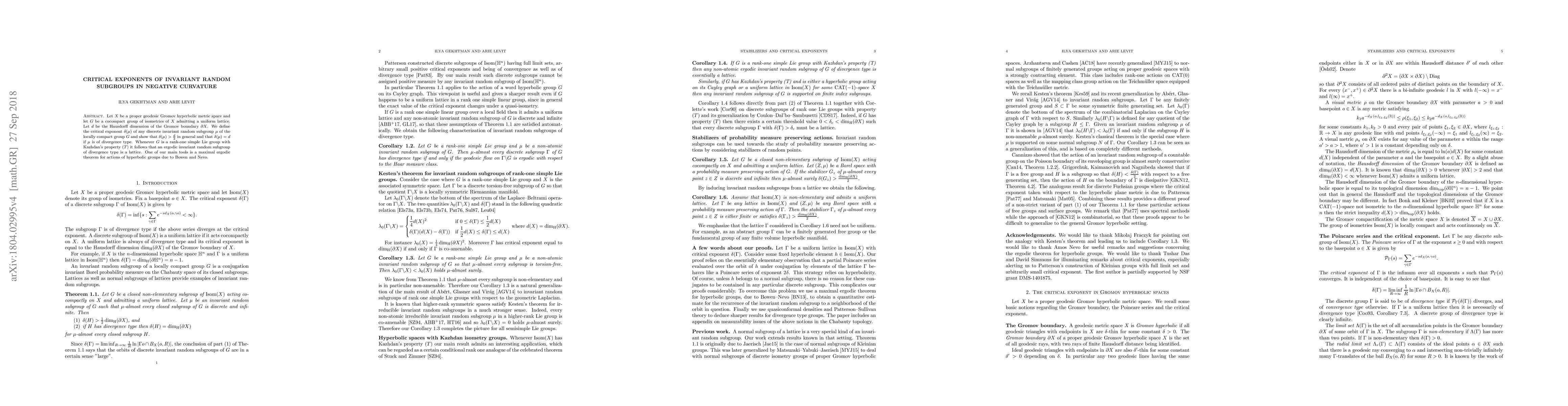 Let $X$ be a proper geodesic Gromov hyperbolic metric space and let $G$ be a cocompact group of isometries of $X$ admitting a uniform lattice. Let $d$ be the Hausdorff dimension of the Gromov boundary $\partial X$. We define the critical exponent $\delta(\mu)$ of any discrete invariant random subgroup $\mu$ of the locally compact group $G$ and show that $\delta(\mu) > \frac{d}{2}$ in general and that $\delta(\mu) = d$ if $\mu$ is of divergence type. Whenever $G$ is a rank-one simple Lie group with Kazhdan's property $(T)$ it follows that an ergodic invariant random subgroup of divergence type is a lattice. One of our main tools is a maximal ergodic theorem for actions of hyperbolic groups due to Bowen and Nevo.