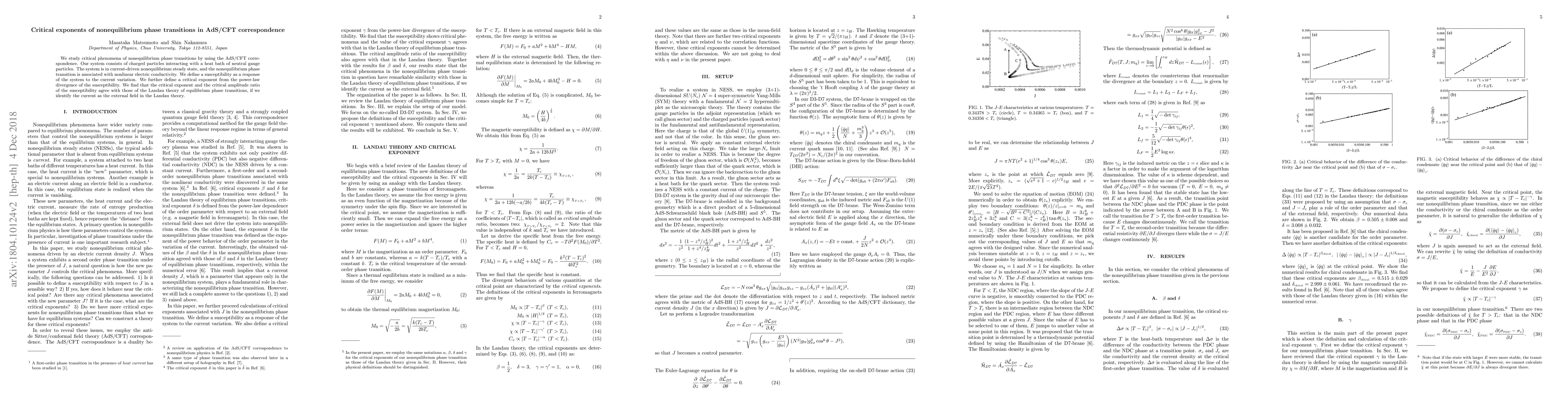 The paper presents a detailed analysis of critical exponents (β, δ, and γ) for nonequilibrium phase transitions using the AdS/CFT correspondence, demonstrating their agreement with equilibrium Landau theory values.
