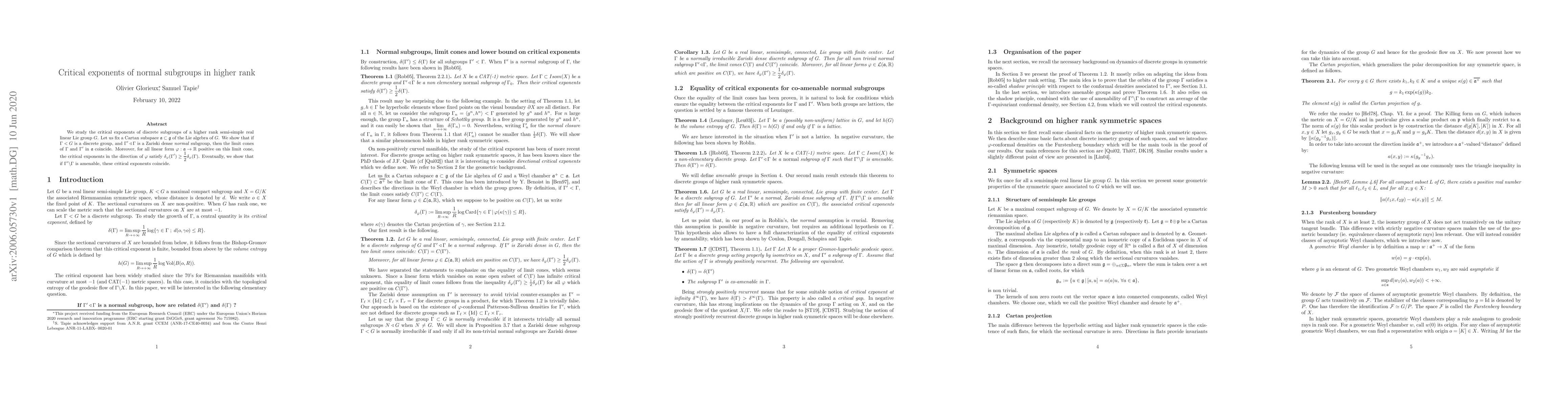 This paper investigates the critical exponents of Zariski dense normal subgroups within discrete subgroups of higher rank semi-simple real linear Lie groups. It demonstrates that the limit cones of such subgroups coincide and that the critical exponents in the direction of positive linear forms satisfy a lower bound, with full equality if the quotient group is amenable.