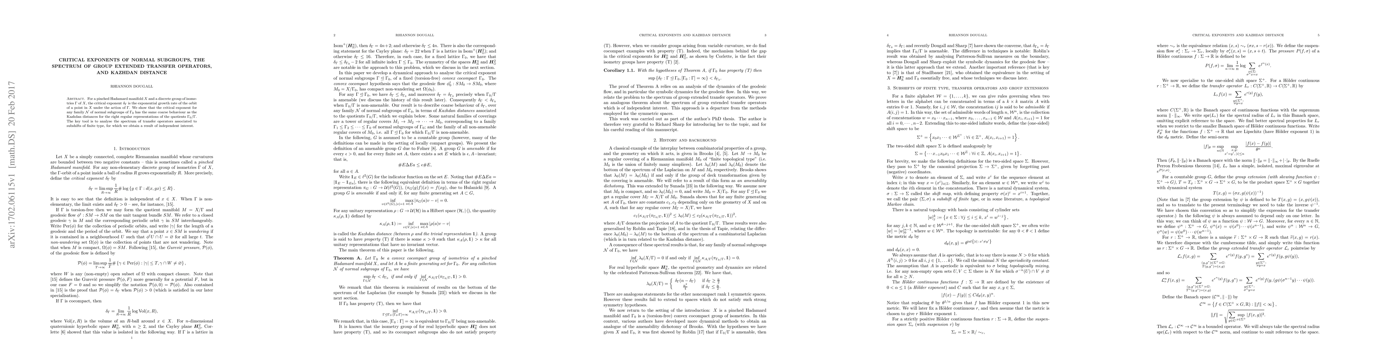 For a pinched Hadamard manifold $X$ and a discrete group of isometries $\Gamma$ of $X$, the critical exponent $\delta_\Gamma$ is the exponential growth rate of the orbit of a point in $X$ under the action of $\Gamma$. We show that the critical exponent for any family $\mathcal{N}$ of normal subgroups of $\Gamma_0$ has the same coarse behaviour as the Kazhdan distances for the right regular representations of the quotients $\Gamma_0/\Gamma$. The key tool is to analyse the spectrum of transfer operators associated to subshifts of finite type, for which we obtain a result of independent interest.