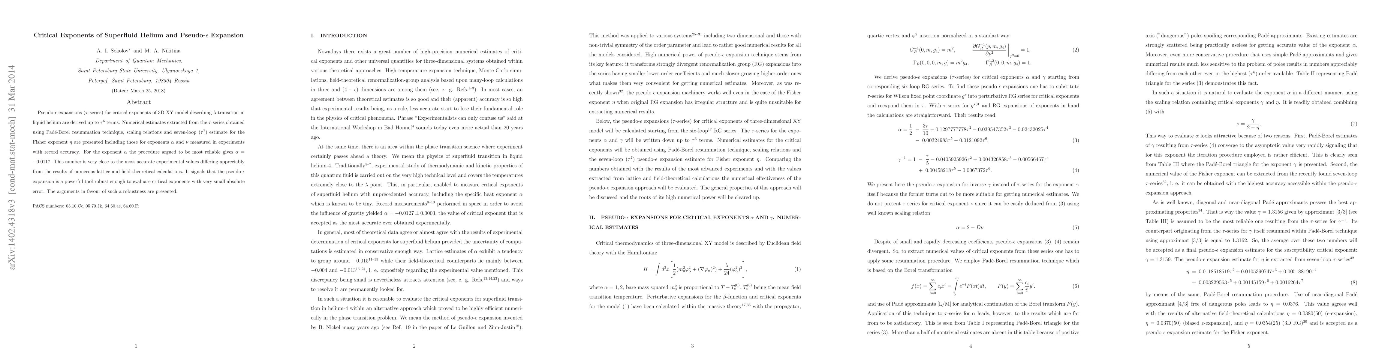 Pseudo-$\epsilon$ expansions ($\tau$-series) for critical exponents of 3D XY model describing $\lambda$-transition in liquid helium are derived up to $\tau^6$ terms. Numerical estimates extracted from the $\tau$-series obtained using Pad\'e-Borel resummation technique, scaling relations and seven-loop ($\tau^7$) estimate for the Fisher exponent $\eta$ are presented including those for exponents $\alpha$ and $\nu$ measured in experiments with record accuracy. For the exponent $\alpha$ the procedure argued to be most reliable gives $\alpha= -0.0117$. This number is very close to the most accurate experimental values differing appreciably from the results of numerous lattice and field-theoretical calculations. It signals that the pseudo-$\epsilon$ expansion is a powerful tool robust enough to evaluate critical exponents with very small absolute error. The arguments in favour of such a robustness are presented.