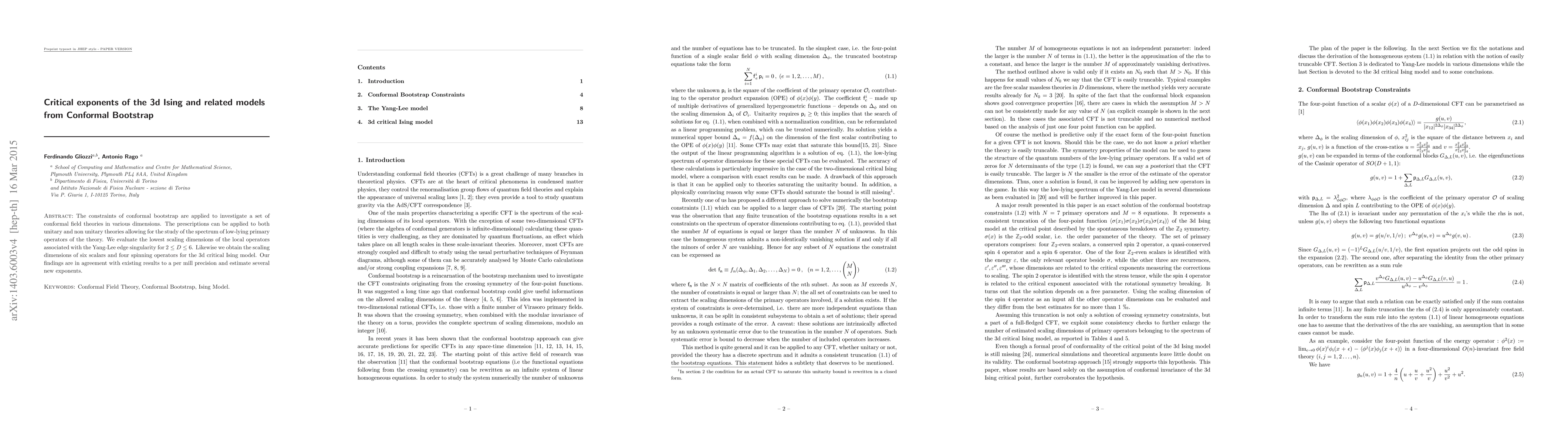 The constraints of conformal bootstrap are applied to investigate a set of conformal field theories in various dimensions. The prescriptions can be applied to both unitary and non unitary theories allowing for the study of the spectrum of low-lying primary operators of the theory. We evaluate the lowest scaling dimensions of the local operators associated with the Yang-Lee edge singularity for $2 \le D \le 6$. Likewise we obtain the scaling dimensions of six scalars and four spinning operators for the 3d critical Ising model. Our findings are in agreement with existing results to a per mill precision and estimate several new exponents.