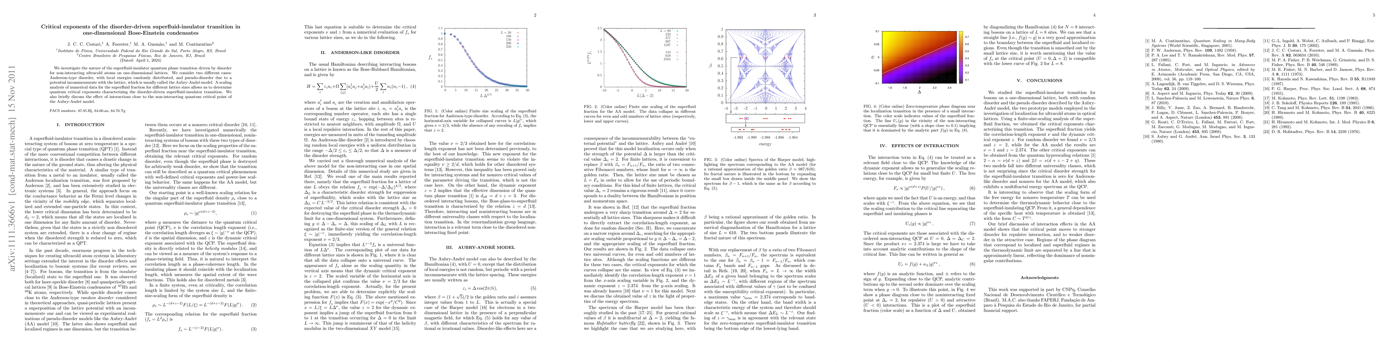 This paper investigates the disorder-driven superfluid-insulator transition in one-dimensional Bose-Einstein condensates, focusing on two types of disorder: Anderson-type and Aubry-André models. The critical exponents for this quantum phase transition are determined through a scaling analysis of numerical data.