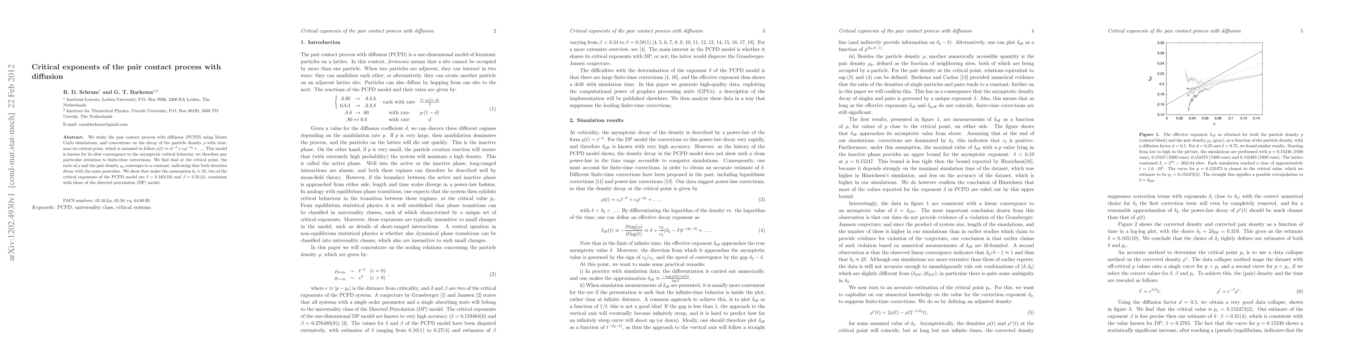 This paper studies the pair contact process with diffusion, finding that its critical exponents are consistent with those of directed percolation, and that both particle densities decay with the same power law at the critical point.