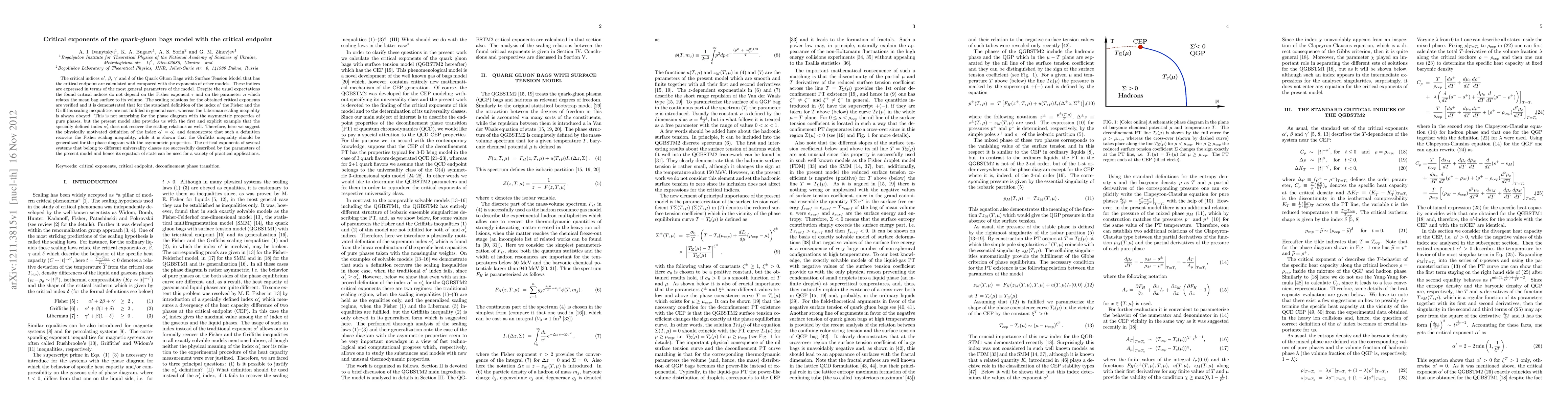 This paper calculates critical exponents for the Quark Gluon Bags with Surface Tension Model featuring a critical endpoint, finding they do not depend on certain parameters. It suggests a new definition of the index α' that recovers the Fisher scaling inequality, while showing that Griffiths inequality needs generalization for asymmetric phase diagrams.