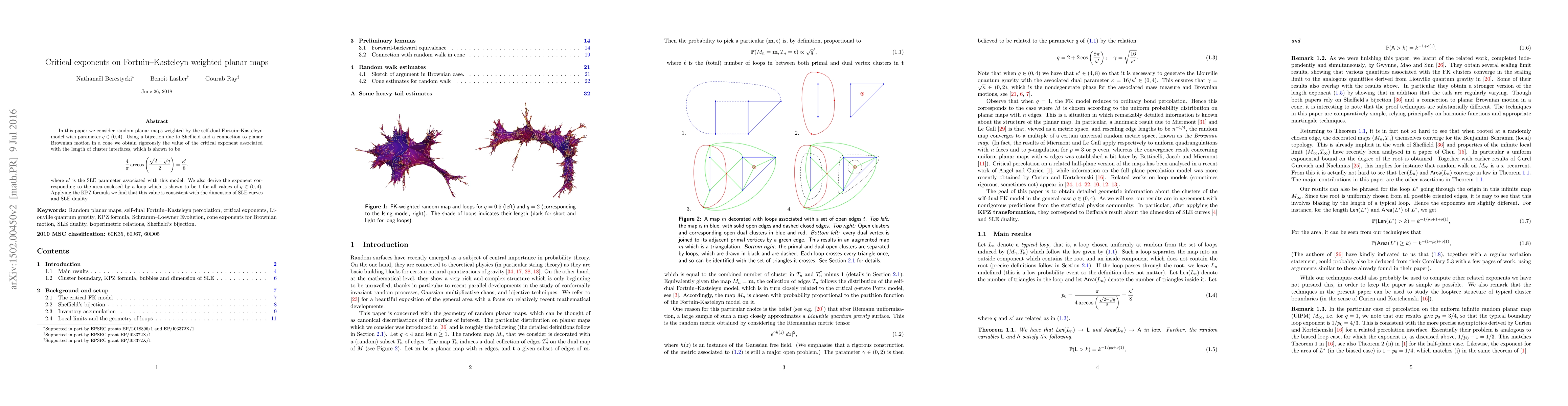 This paper rigorously determines critical exponents for random planar maps weighted by the Fortuin-Kasteleyn model, finding the exponent for cluster interface length to be $\frac{4}{\pi} \arccos \left( \frac{\sqrt{2 - \sqrt{q}}}{2} \right)$ and the exponent for loop-enclosed area to be 1 for $q \in (0,4)$.