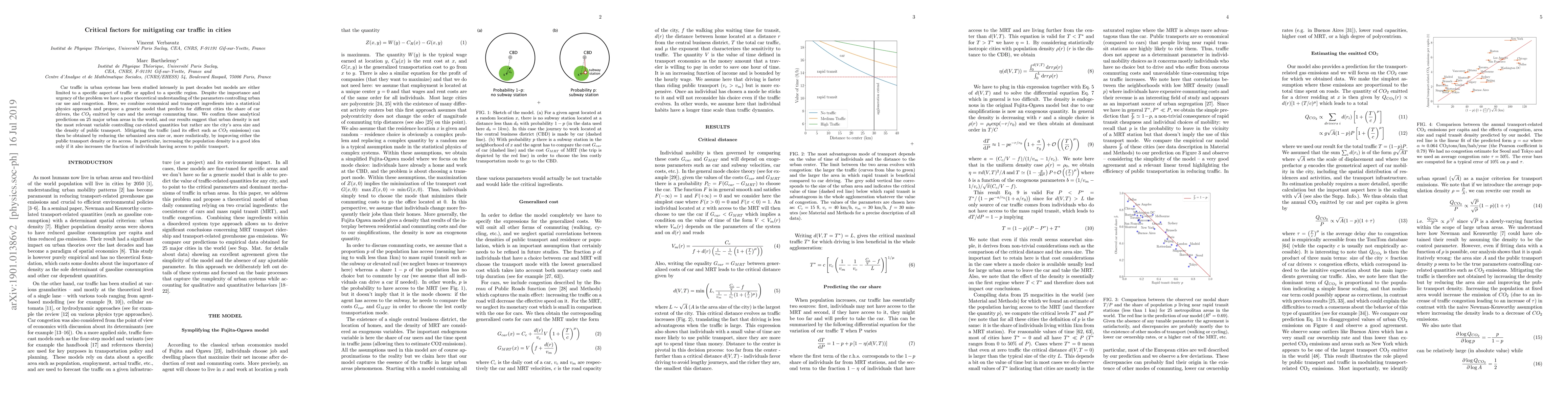 This paper proposes a statistical physics model to understand urban car traffic, finding that city area size and public transport density, rather than urban density, are key factors. The model predicts car usage, $CO_2$ emissions, and commuting times, suggesting that reducing urban area size or enhancing public transport can mitigate traffic congestion.