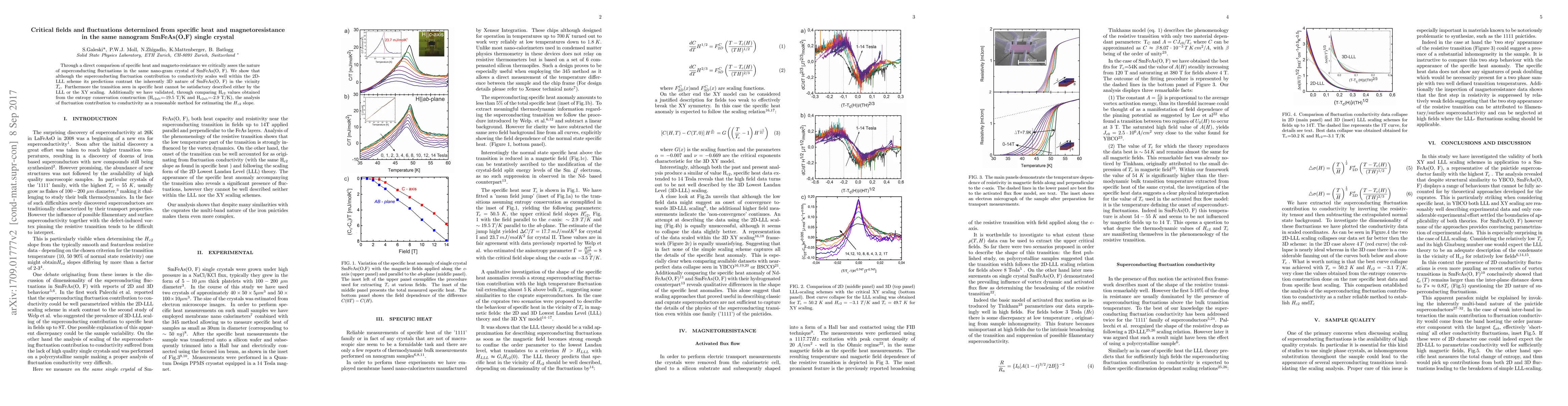 Through a direct comparison of specific heat and magneto-resistance we critically asses the nature of superconducting fluctuations in the same nano-gram crystal of SmFeAs(O, F). We show that although the superconducting fluctuation contribution to conductivity scales well within the 2D-LLL scheme its predictions contrast the inherently 3D nature of SmFeAs(O, F) in the vicinity T_{c}. Furthermore the transition seen in specific heat cannot be satisfactory described either by the LLL or the XY scaling. Additionally we have validated, through comparing Hc2 values obtained from the entropy conservation construction (Hab=-19.5 T/K and Hab=-2.9 T/K), the analysis of fluctuation contribution to conductivity as a reasonable method for estimating the Hc2 slope.