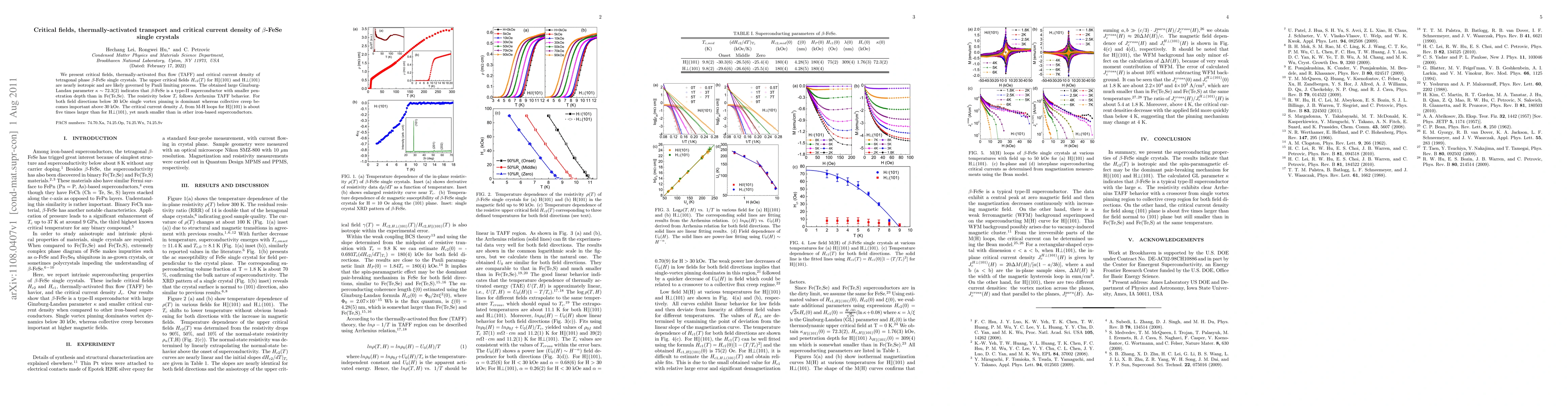 We present critical fields, thermally-activated flux flow (TAFF) and critical current density of tetragonal phase beta-FeSe single crystals. The upper critical fields Hc2(T) for H||(101) and H\bot(101) are nearly isotropic and are likely governed by Pauli limiting process. The obtained large Ginzburg-Landau parameter k \sim 72.3(2) indicates that beta-FeSe is a type-II superconductor with smaller penetration depth than in Fe(Te,Se). The resistivity below Tc follows Arrhenius TAFF behavior. For both field directions below 30 kOe single vortex pinning is dominant whereas collective creep becomes important above 30 kOe. The critical current density Jc from M-H loops for H||(101) is about five times larger than for H\bot(101), yet much smaller than in other iron-based superconductors.